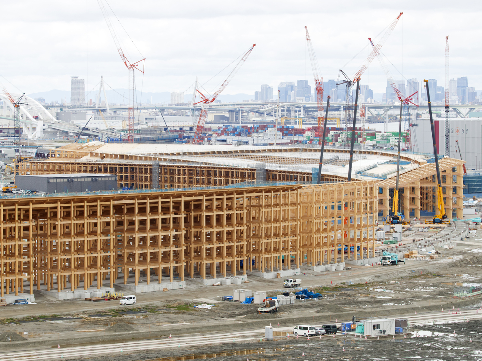 Den Sou Fujimoto-tegnede treringen rundt hele Expo-området i Osaka la beslag på det meste av det lokale trevirket. Her er ringen under oppføring.