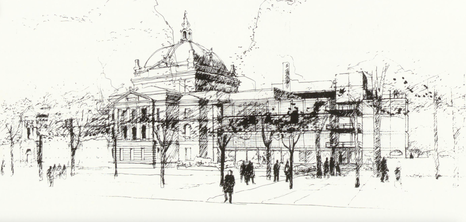 Slik så Lund & Slaatto i 1973 for seg en utvidelse av teateret i samme retning som LPO foreslår. Forslaget vant førstepremie i en arkitektkonkurranse, men ble skrinlagt.