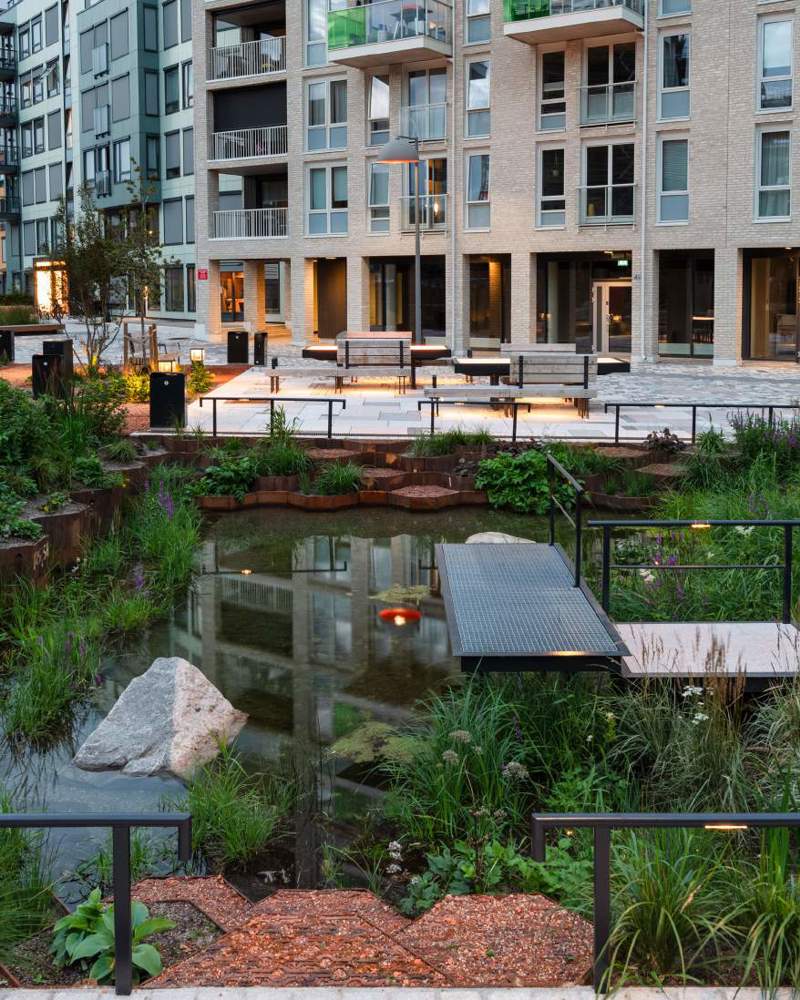 Plantekanter og damanlegg på Vollebekk torg er bygget opp av overskuddsmaterialer som spuntrør og takstein, påpeker juryen.