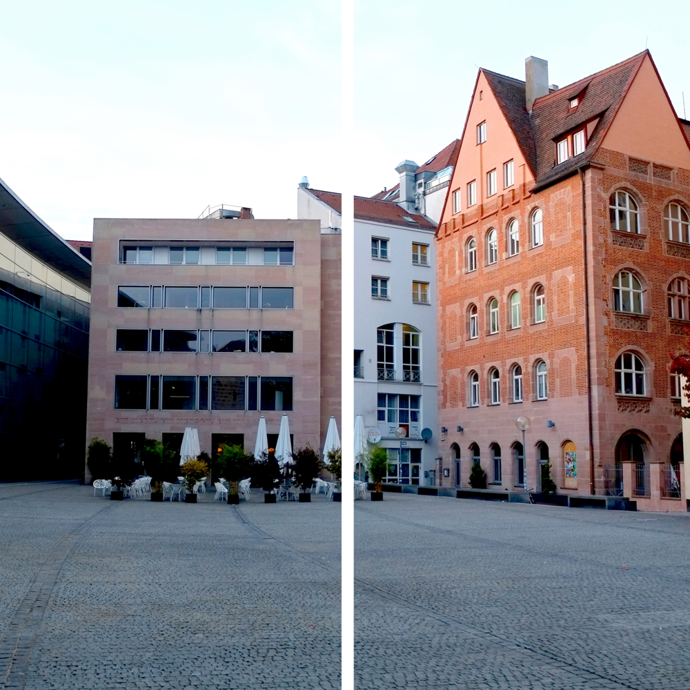 Kan en glassfasade skape stress – og kan detaljert gammel arkitektur gjøre oss rolige? Ja, mener psykolog Saher Sourouri i Arkitekturopprøret. Her Klarissenplatz utenfor Neues Museum i Nürnberg. Museet med den hundre meter lange glassfasaden er tegnet av den tyske arkitekten Volker Staab og åpnet i 2000. Foto: Pixabay