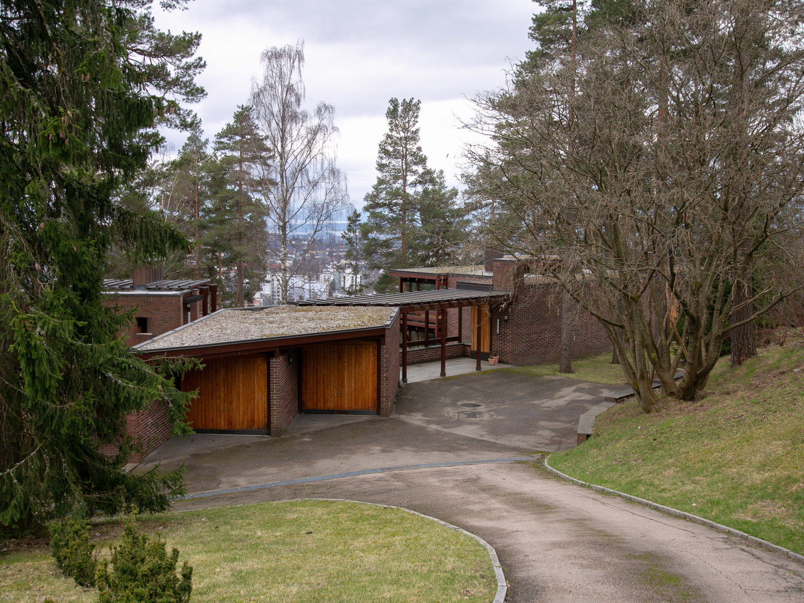 Løsningen ble to kubiske former i tegl hvor terrassen tar imot deg fra ankomstveien, som ligger høyere enn tomten. Takterrassen og inngangspartiene gir deg horisonten og den ro du trenger før du åpner døren til de to husenes labyrintiske romløsninger. Leken med de kvadratiske planers vridninger 45 grader gjør at bygningenes hjørner blir vesentlige. På disse punkter utfolder arkitekturen sin konstruktive akrobatikk.