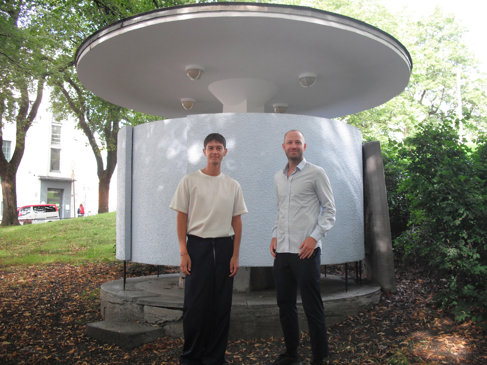Eirik Stokke (til venstre) og Espen R. Heggertveit foran Kjærlighetskarusellen, som de to arkitektene nå har skrevet bok om.