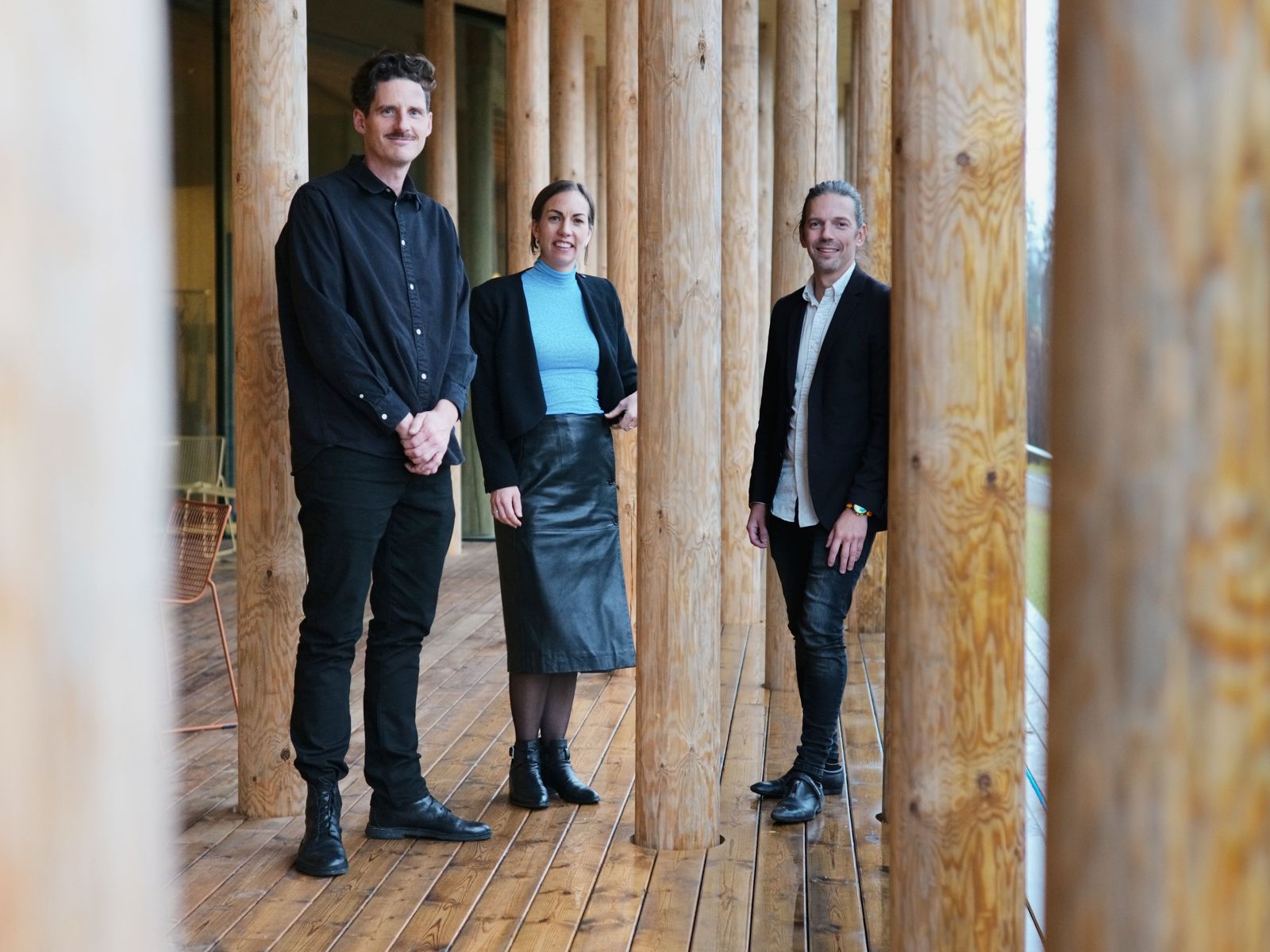 Tsjekkiske Juráš Lasovský (fra venstre) og svenskene Hanna Johansson og Filip Lipinski har tegnet Skogfinsk museum. Her er arkitektene under åpningen fredag.