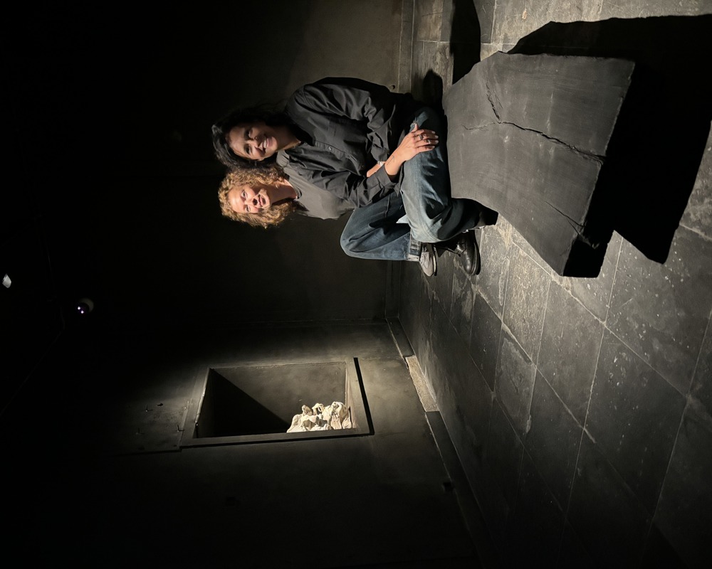 Irene Nordli (t.v) og Jenny Mäki på en brent ospebenk i det gamle bankhvelvet i galleriet Kraft.
