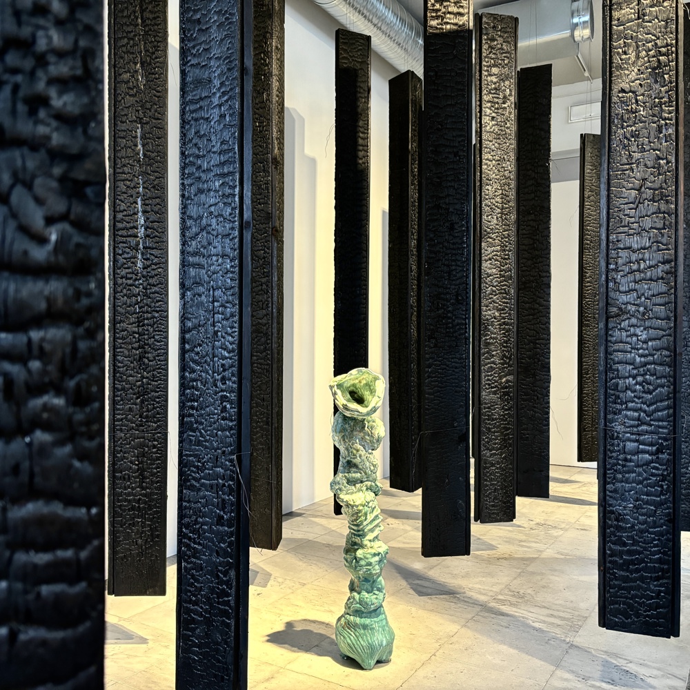 Forkullet tre og organisk keramikk forenes i utstillingen Brann i Bergen.