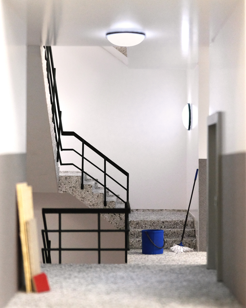 Et typisk trapperom i et Tom Rom-bygg. Modellen laget av Daniel Larsen.
