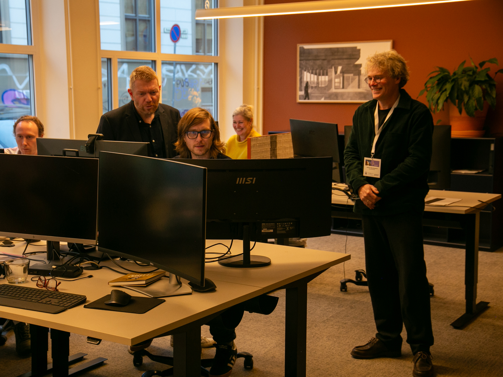 Spenningen er stor like før Arkitektbedriftene lanserer sine nye nettsider. Fra venstre: utvikler Jens Ragnar Lind, kommunikasjonssjef Geir Lindhjem, utvikler Kjetil Ormestad Eid og administrerende direktør Steinar Skjerdingstad. I bakgrunnen skimtes Birgitte Rubæk.