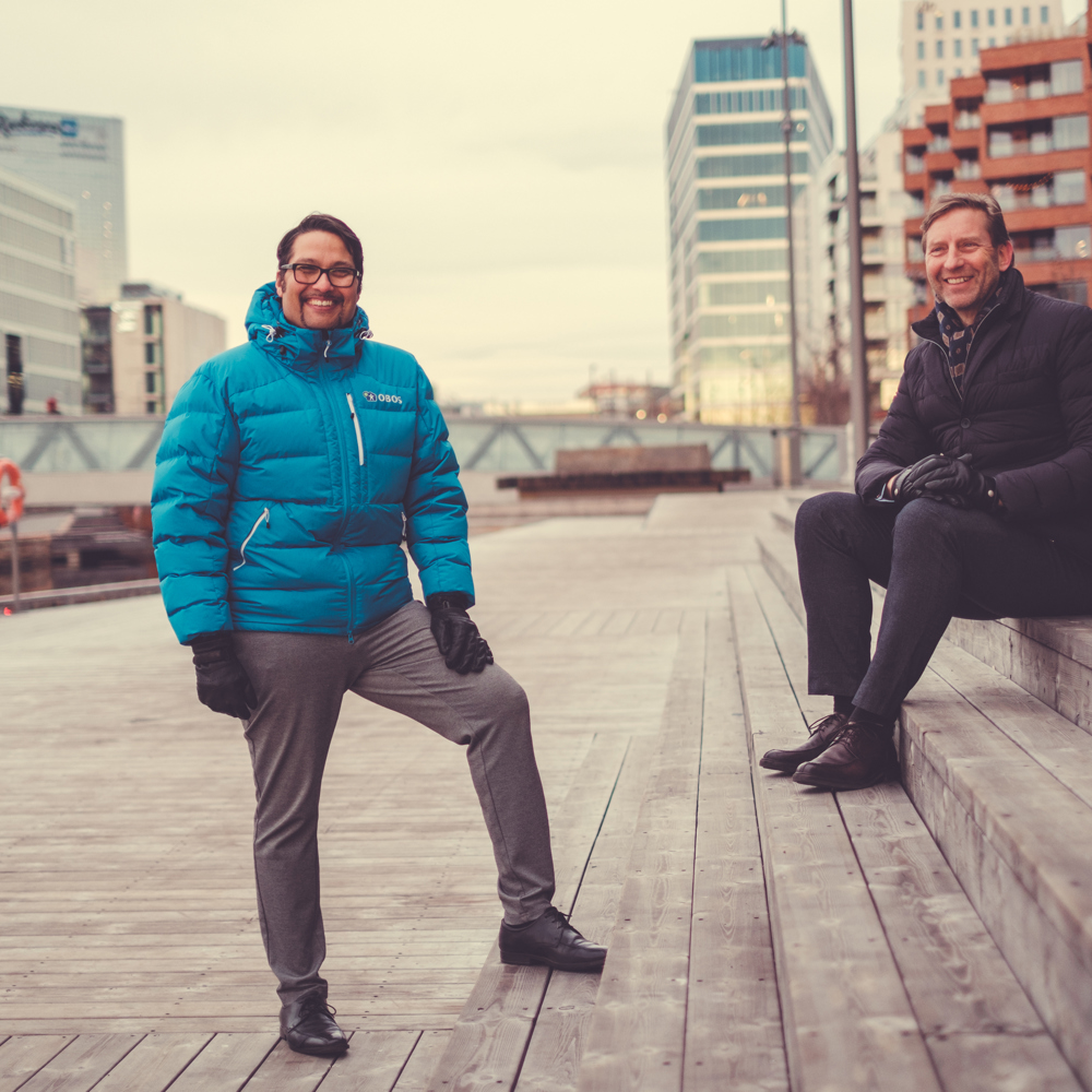 – Uavhengig av koronasituasjonen er det å fly ned hundrevis av nordmenn ikke forenlig med vår økende bevissthet rundt bærekraft, sier styreleder i OMA og administrerende direktør i Stor-Oslo Eiendom, Mathis Grimstad (t.h). Konsernsjef i Obos, Daniel K. Siraj, ser frem til å holde Obos-konferanse under arrangementet i Bjørvika.