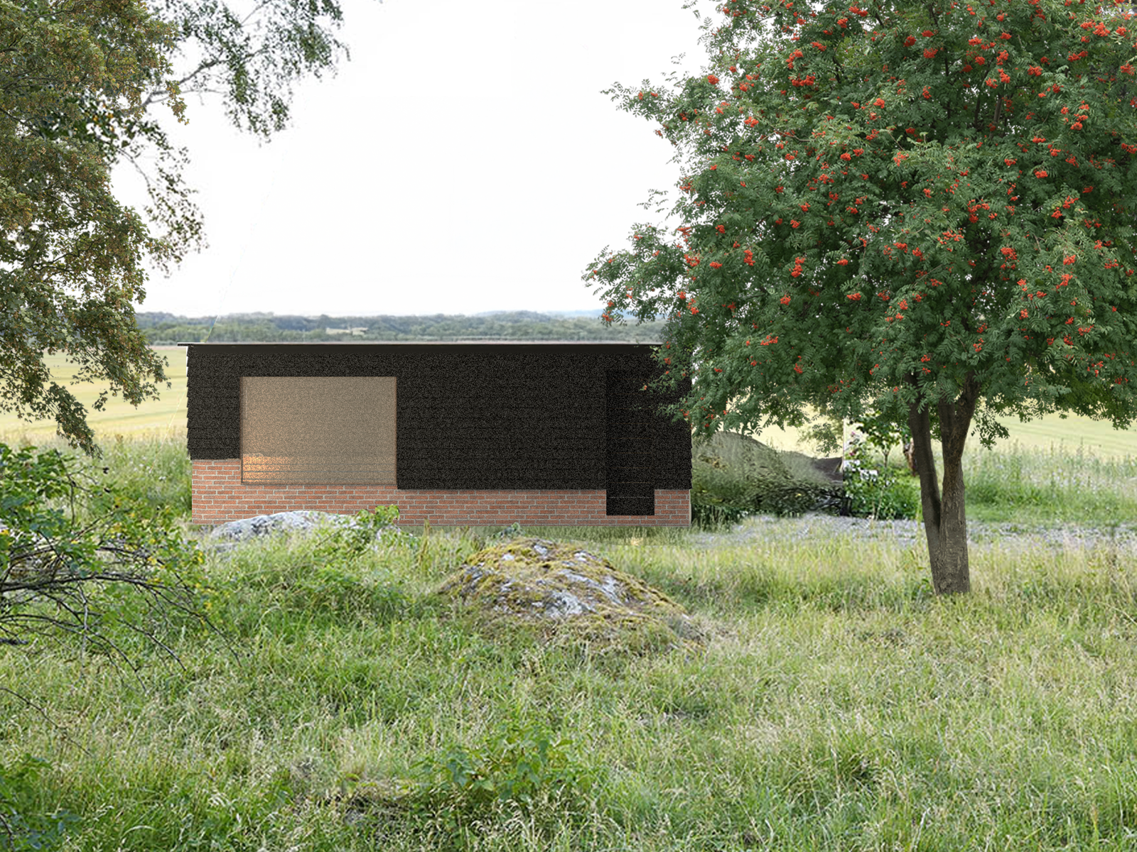 Prosjektert badstue til Bae gård. Grunnmuren er i resirkulert tegl og vegger i trevirke som allerede er på gården.