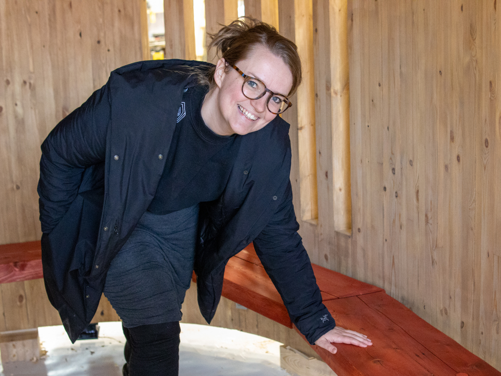 Daglig leder Kjersti Monsen i det inkluderende arktiske byrommet i Vadsø. Benkene i den urbane gapahuken er laget av en gammel laftekasse. Verte og Ly Minihus står for designet, og sistnevnte også for byggingen.