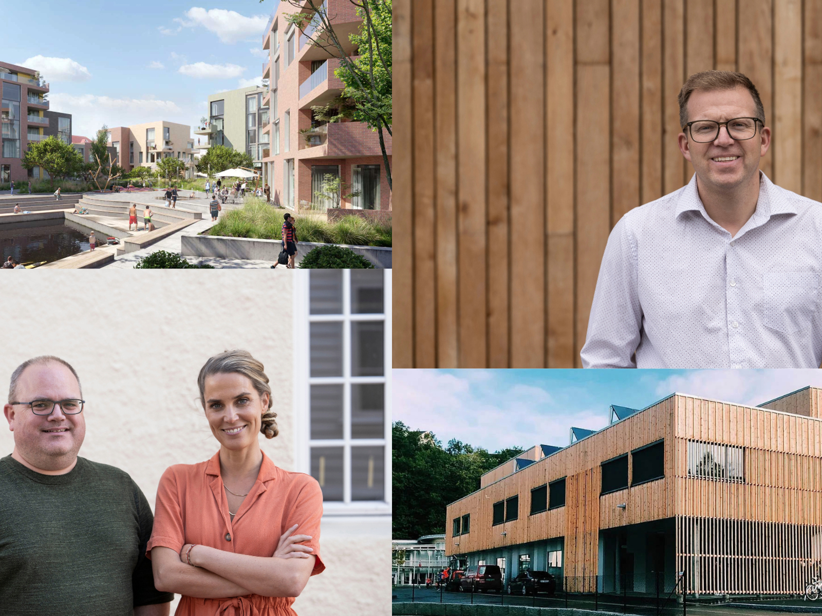 Øverst til venstre: Svankevigå i Stavanger, tegnet av Stav arkitekter. Nederst til venstre: Henning Bøe, daglig leder og Evy Eftestøl, partner i Stav. Øverst til venstre: Stein Åge Fuglestveit, arkitekt og senioringeniør i Drag. Nederst til høyre: Frøysland flerbrukshall, prosjektert av Drag.