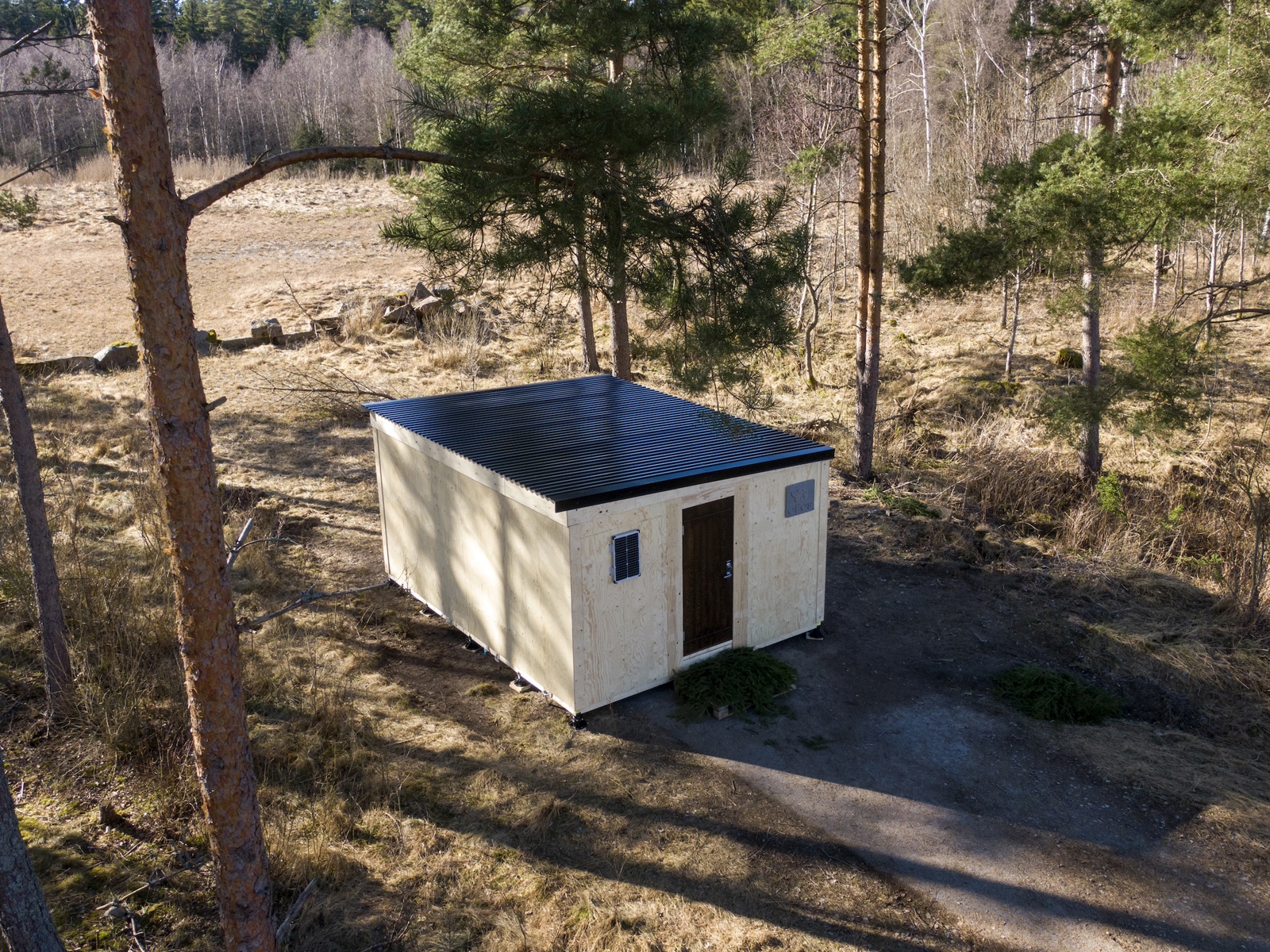 Åtte av OBOS nye nødboliger skal fraktes til de vestre delene av Ukraina i løpet av april. Her en at av husene i fredelig svensk skog.