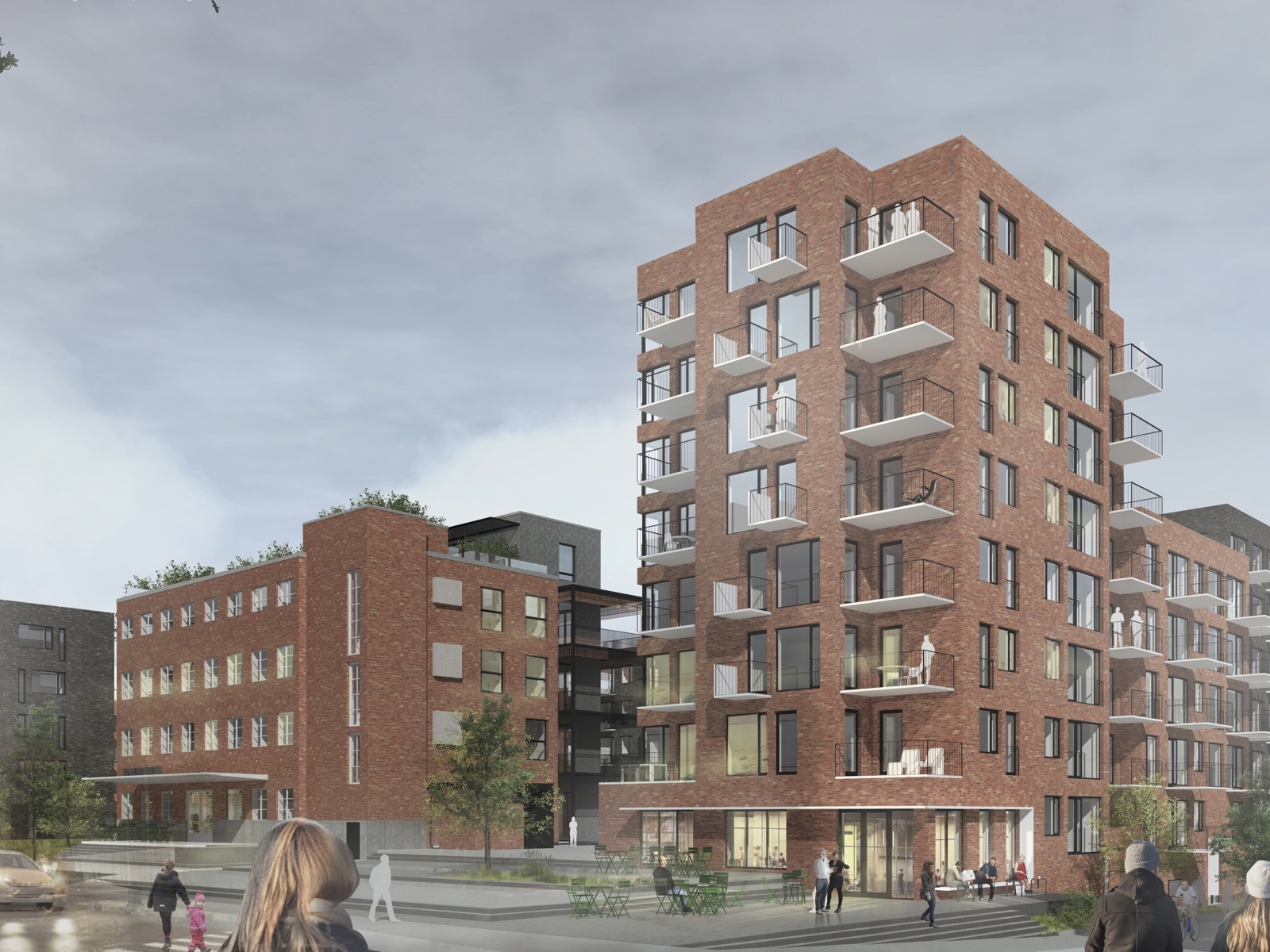 Illustrasjon av prosjektet, slik det så ut da det ble sendt inn til politisk behandling i 2023. Tranfabrikken til venstre i bildet.