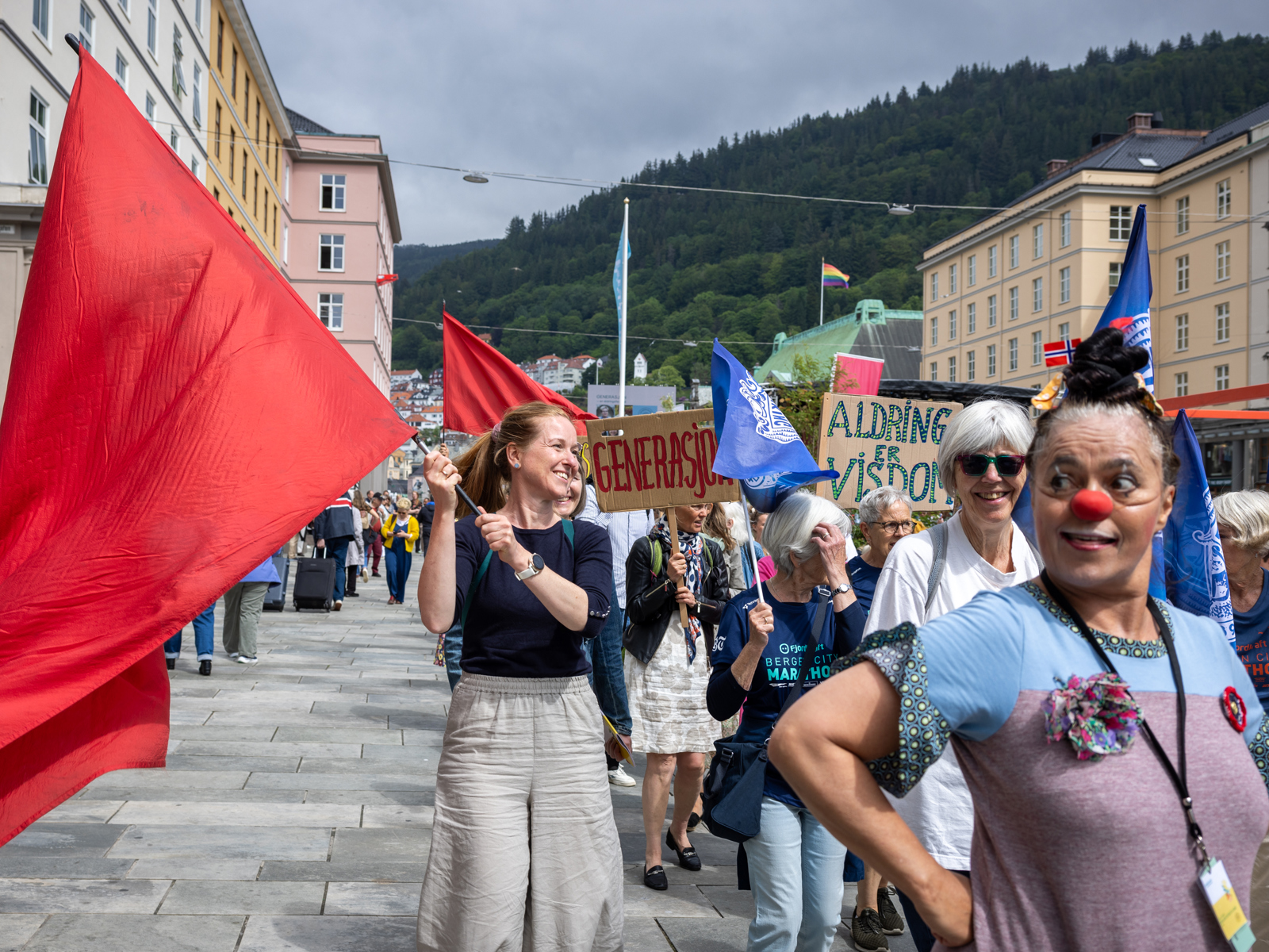 Å løfte aldringens verdi ut i samfunnet og vise solidaritet på tvers av generasjoner er sentralt for aldringsfestivalen i Bergen. Her fra festivalens generasjonsopptog på Torgallmenningen.