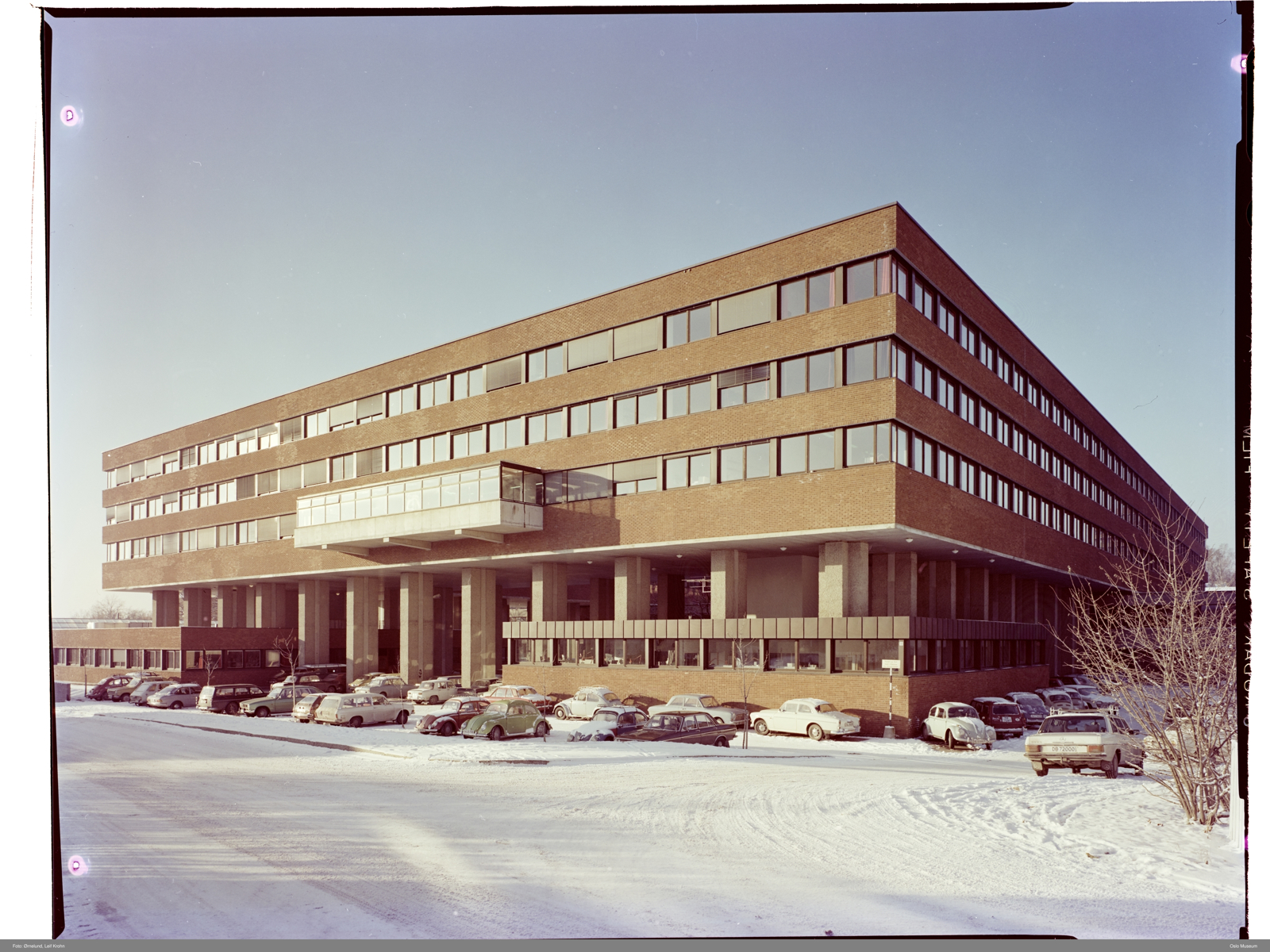 Biologibygget på Blindern, omkranset av biler, fra den tiden da universitetsområdet var en diger parkeringsplass.