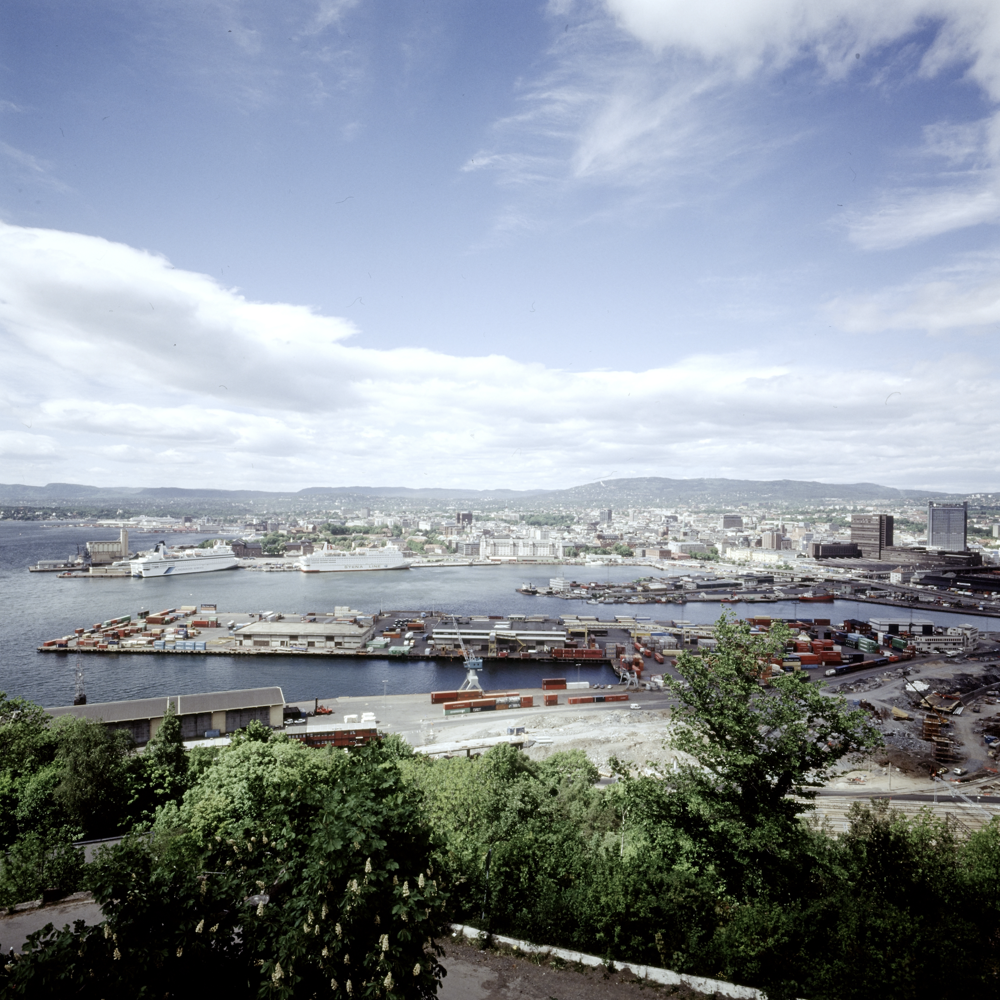 Fra Sjøsiden foran Østbanehallen kan man skimte alle fire av Oslos sedimenter. Ca. 1980.