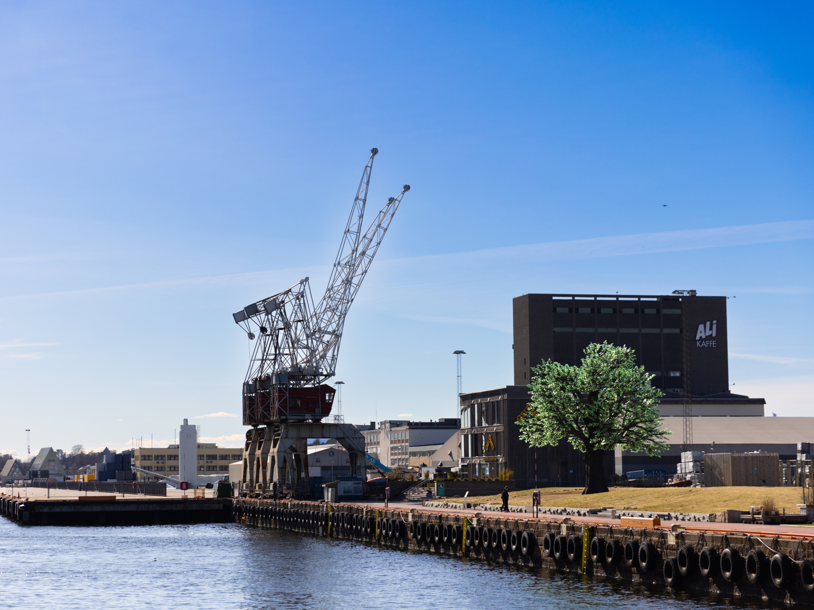 Filipstad i dag: Kraner, kaffetårn og et kunstnerisk tre, bestående av 125.000 programbare led-lamper, laget av kunstneren Alexander Green, og donert av milliardær Stein Erik Hagen, etter at han kjøpte det på Burning Man-festivalen i Nevada i USA. I det fjerne skimtes Fram- og sjøfartsmuseene på Bygdøy.
