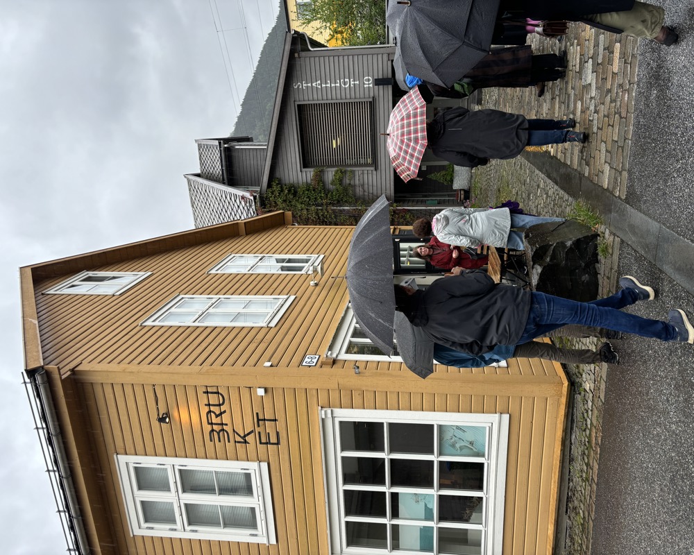 Mari Myklebust (rød jakke) låser opp døra og inviterer våte konferansedeltakere inn på Bruket for et glass.