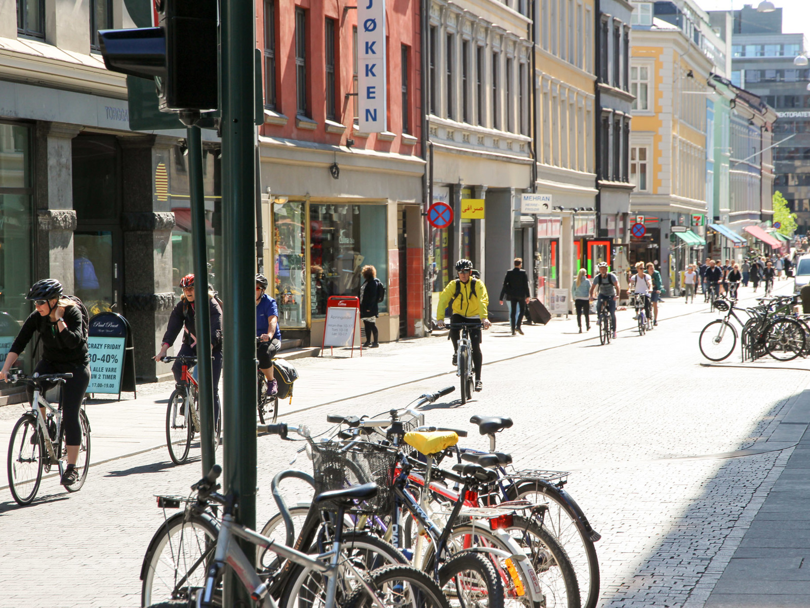 I Norconsult-podkasten Prosjektkontoret tar de et oppgjør med begrepet «ja»-kommuner og spør: «Hvem er premissleverandør for utformingen av norske byer? Her syklister og gående i Torggata i Oslo. Foto: Norconsult