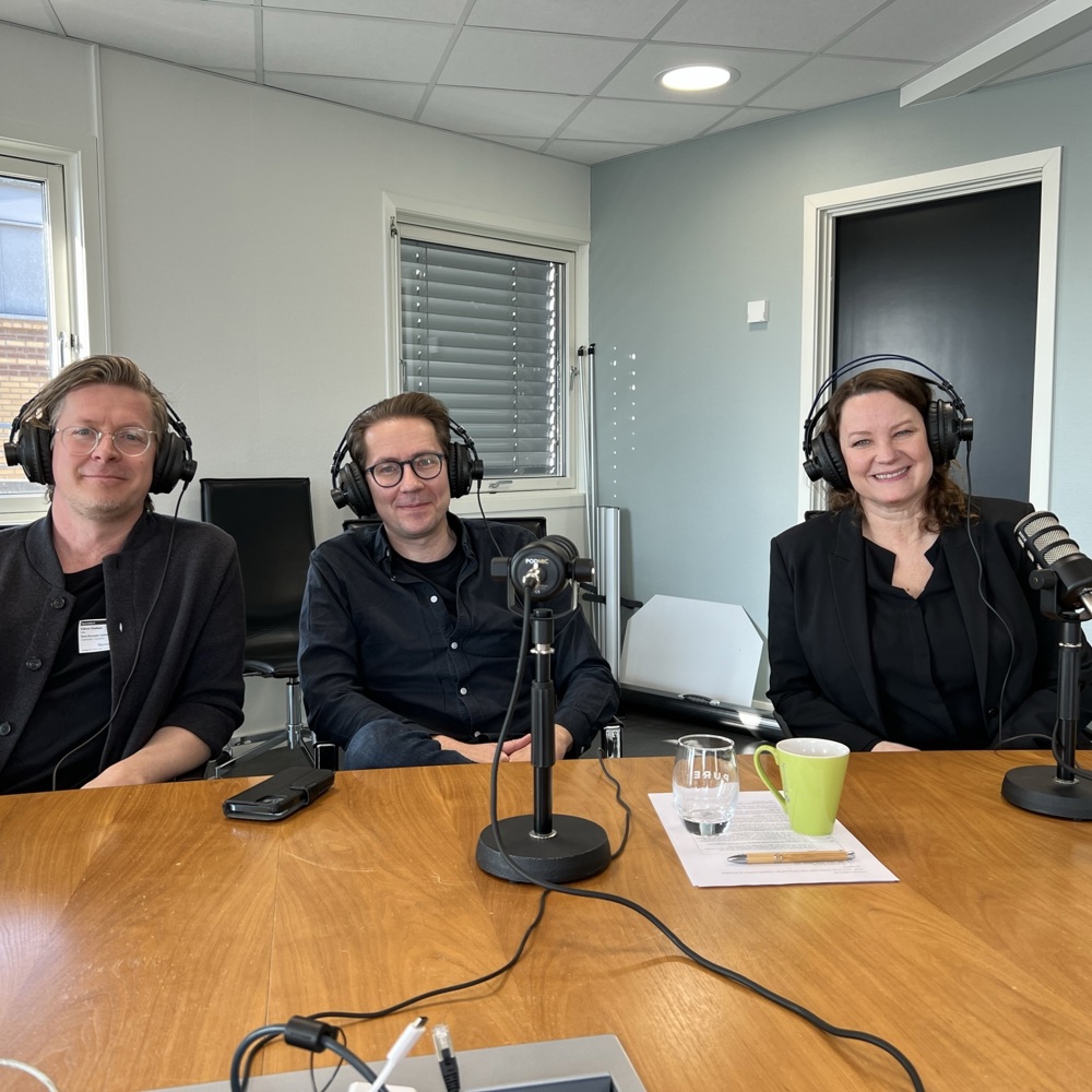Halvor Weider Ellefsen (AHO), Vigleik Winje (Karmøy kommune) og Rina Brunsell Harsvik (Norconsult) spør «Hva er en by?» i Norconsults podkast Prosjektkontoret. Foto: Norconsult