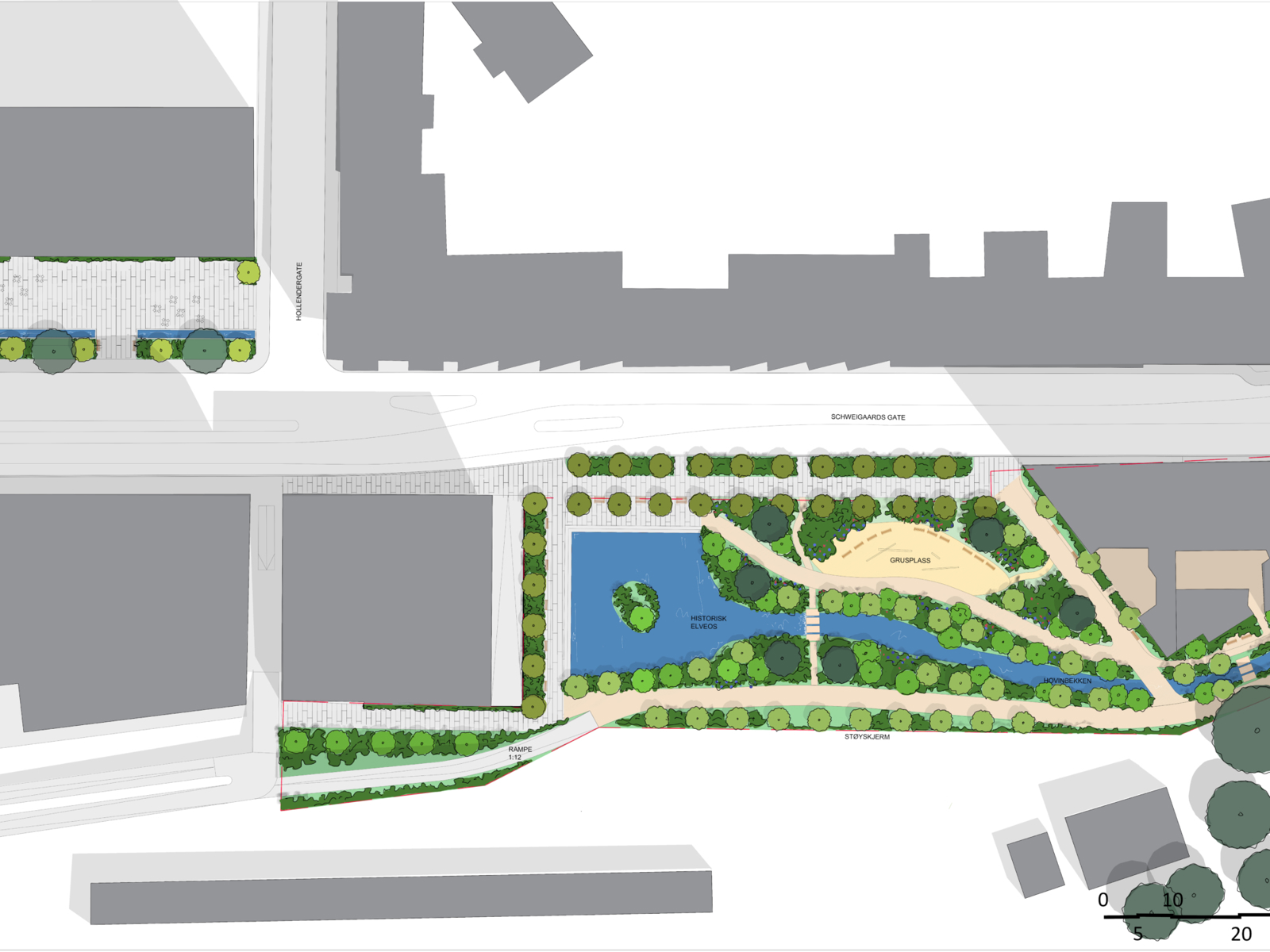 – Dette kan bli en liten, men svært viktig park i det som må være en av Oslos tristeste gater. Her kan vannet og det grønne gi det jeg kaller en «herlighetsfaktor» til nabolaget, sier Rainer Stange, partner i Dronninga landskap og professor i landskapsarkitektur, til Arkitektnytt.
