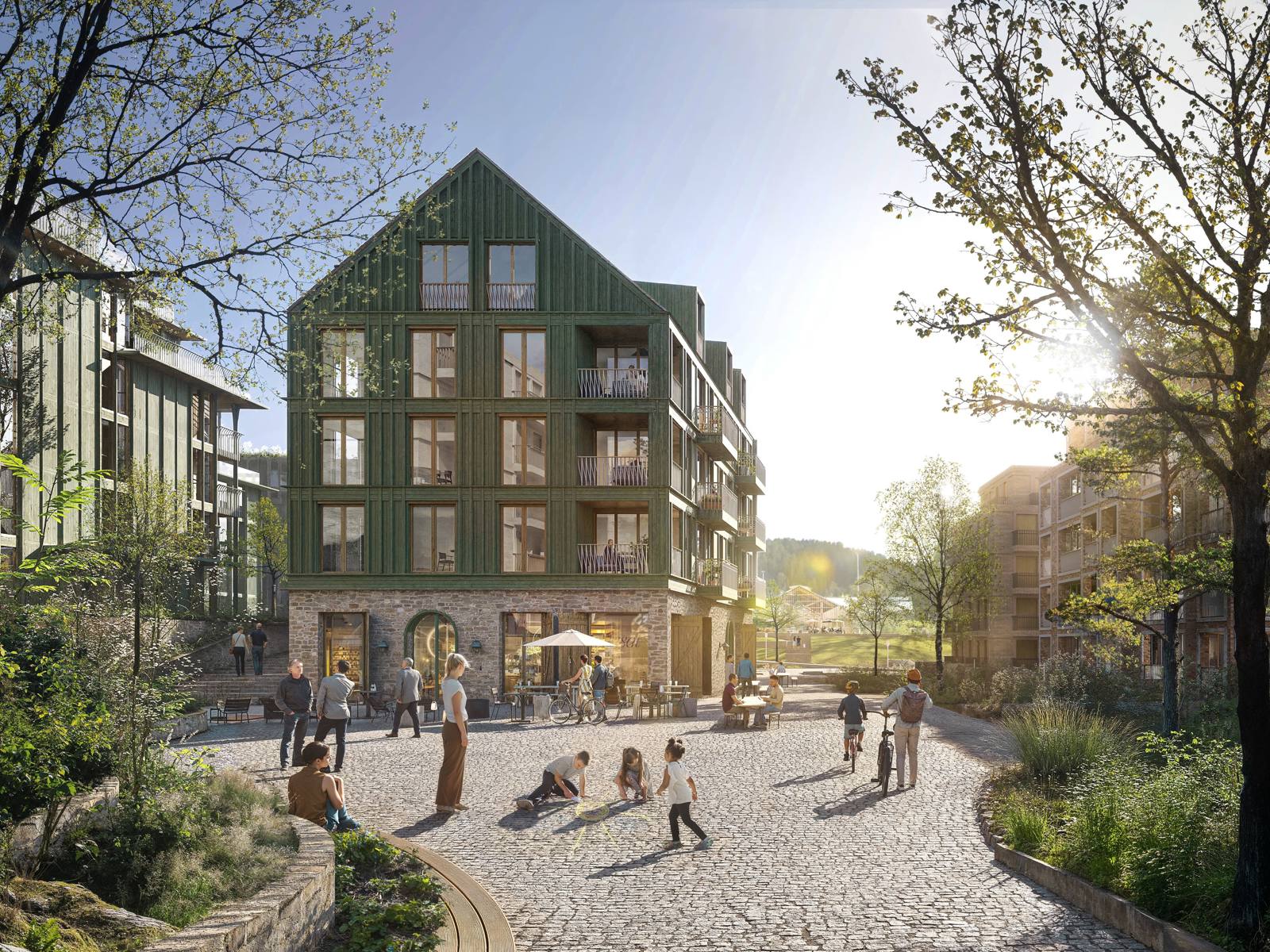 Utbyggerne satser på variert arkitektur, bygget med materialer som skal tåle tid og vær – tegl, tre og stein – og med farger hentet fra Østmarka.