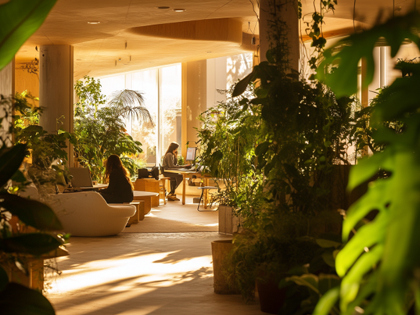 Visualisering generert ved hjelp av KI. Uttesting av naturlige materialer og former, samt beplantning for å undersøke ulike designretninger innenfor kontorlandskap.