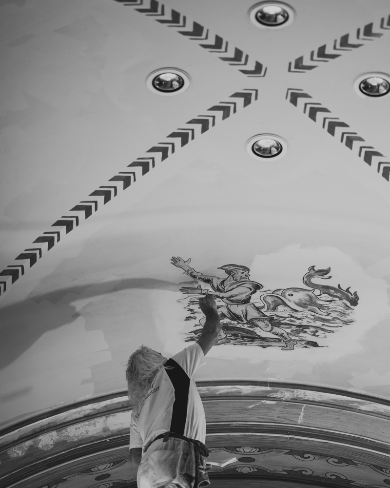 Veggmaleriene har lenge vært dårlig behandlet. De seks restauranter med hvert sitt åpne kjøkken satte spor. Nå er freskene derfor vasket og fisket for sår. I restaureringen oppdaget de også den opprinnelige takmalingen, i dag er den identisk med slik den var som ny i 1923.