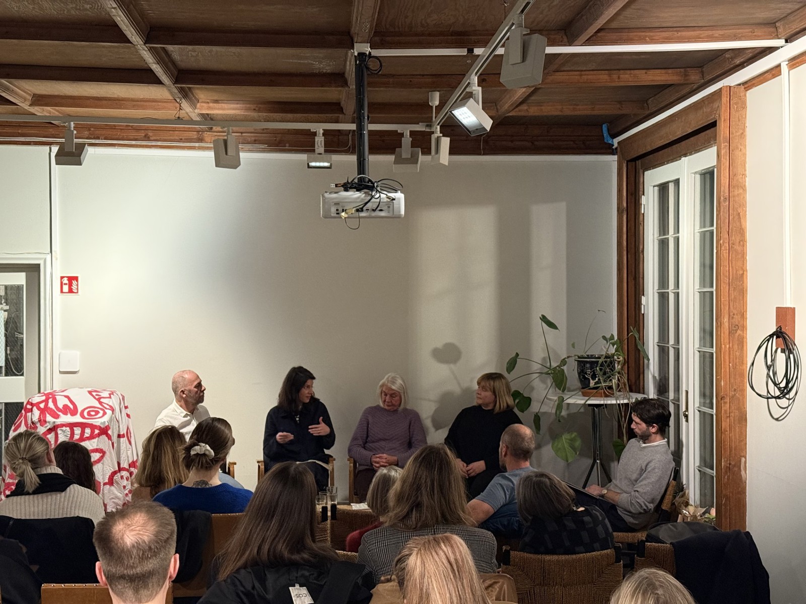 NILs Oslogruppe samlet et bredt panel av interiørarkitekter til samtale om endringer i Hagestuen, Arkitektenes hus. F.v.: Jeremy Williams, Malin Skjelland Eriksen, Ellen S. Klingenberg og Kaja Kosonen Geiran. Ordstyrer Jens Vik (t.h.) ledet samtalen.