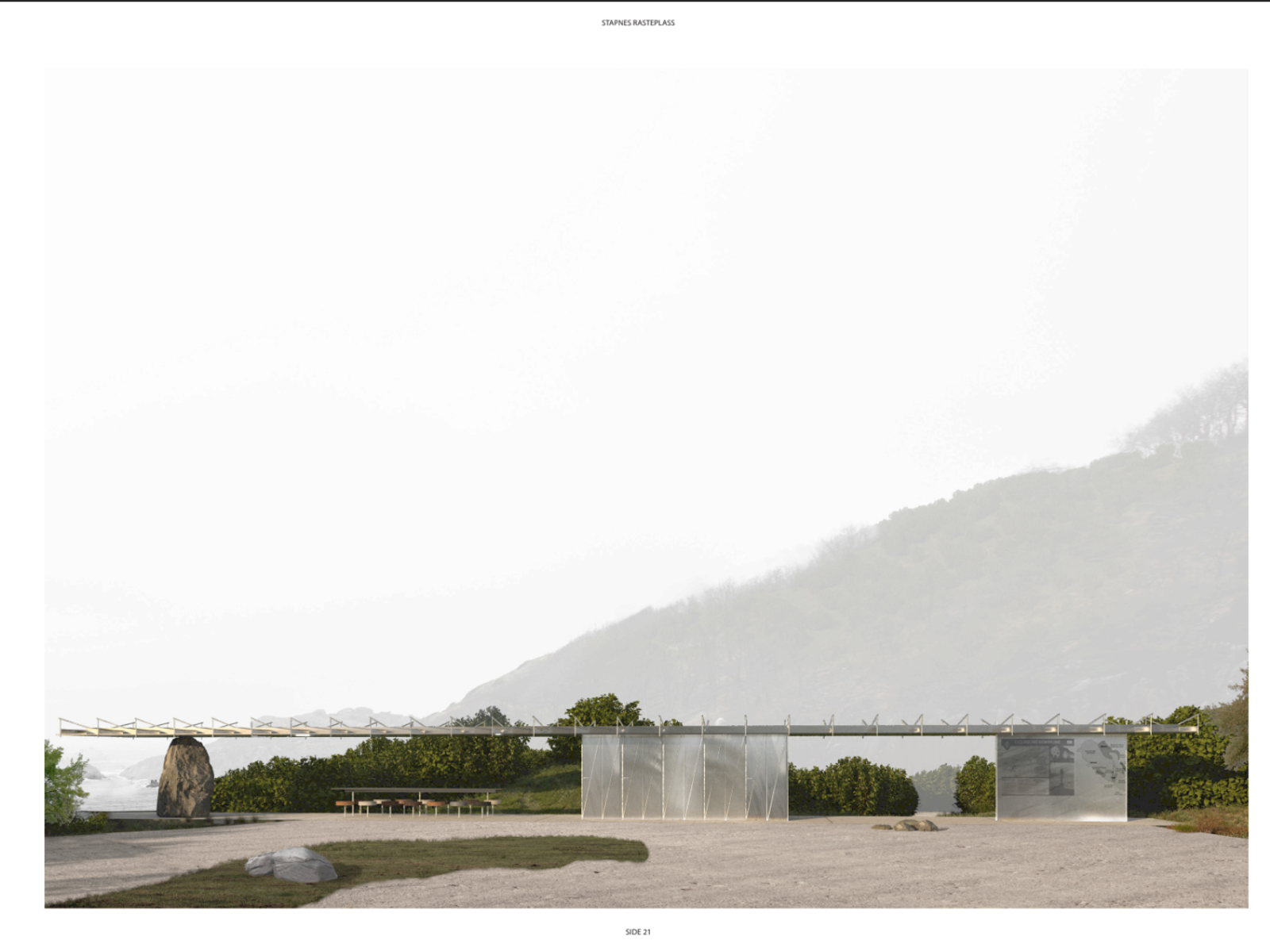 Foto: Stanislaw Daniel Rudzki (illustrasjon)Sanden+Hodnekvam, Eladio Ramm, White arkitekter og Atsite har vunnet konkurranse om hver sitt stopp på Nasjonale turistveg-strekninger. Det ble annonsert under tirsdagens arkitekturseminar under Nasjonale turistvegers jubileumsarrangement RAST på Arkitektur- og designhøgskolen i Oslo.