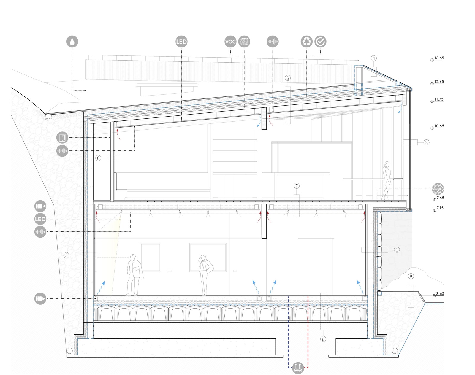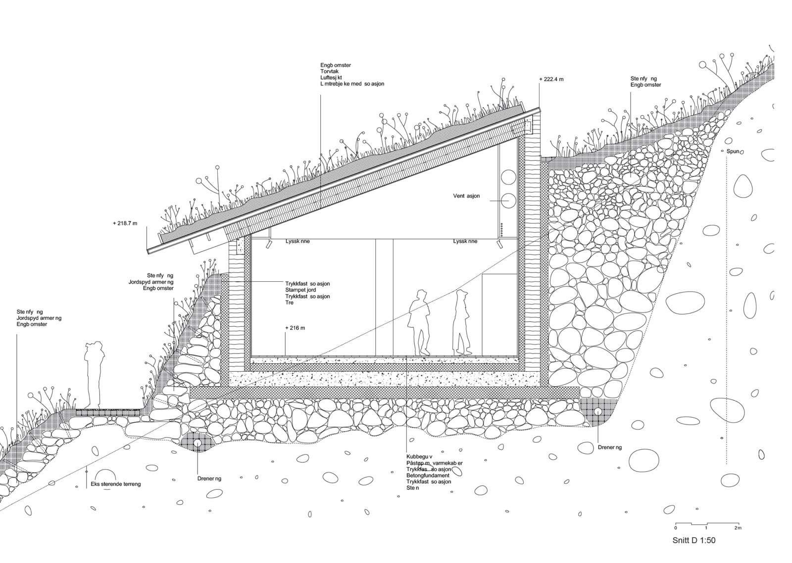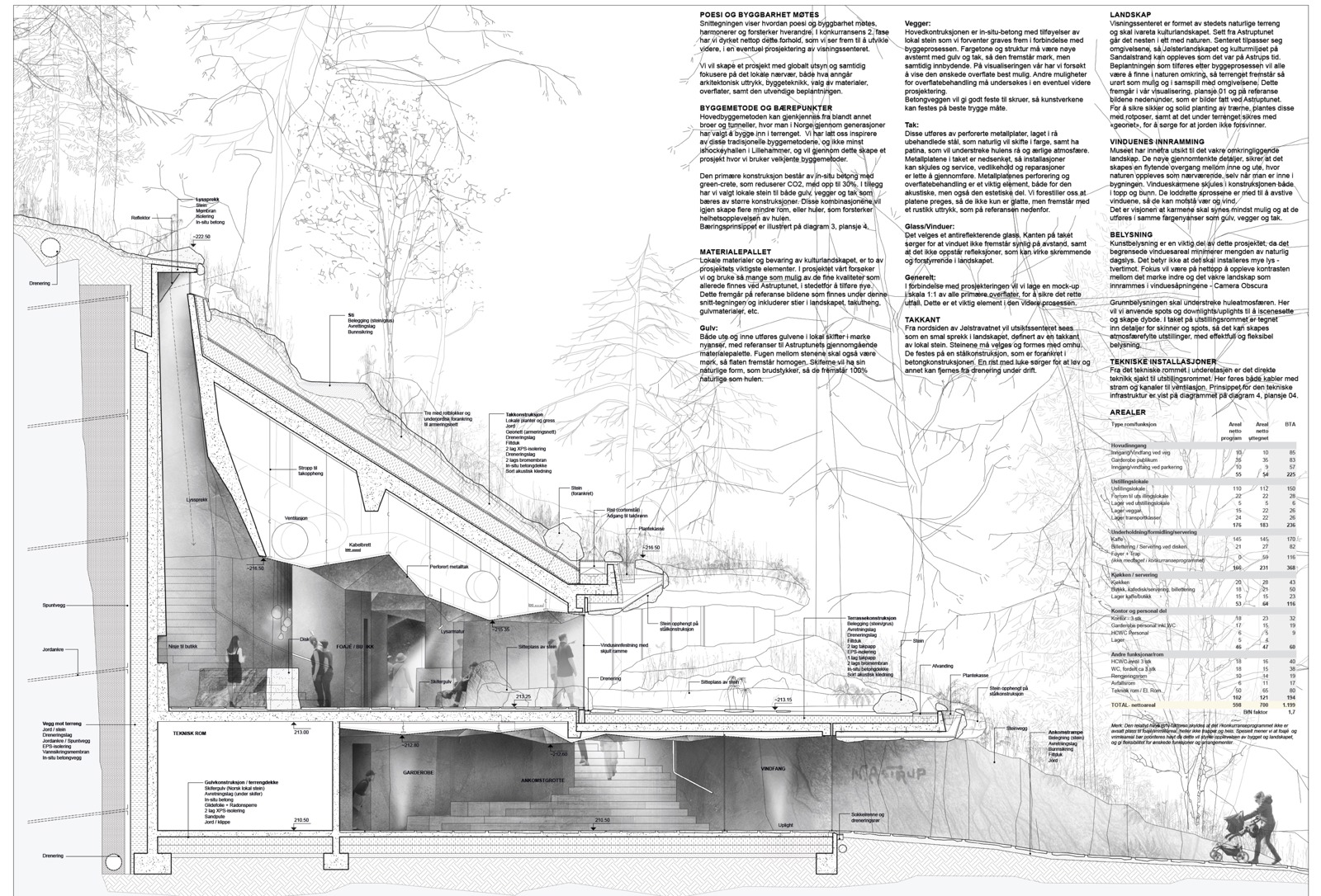 «Med inspirasjon fra Nikolai Astrups maleri «hulen» har vi valgt å plassere bygningen inne i skråningen, slik at visningssenteret og landskapet oppleves integrerende og formidles som en helhet. Visningssenteret er usynlig fra Astruptunet og oppleves kun som en smal sprekk sett fra fylkesvegen. Vinduspartiene fremstår som åpninger mellom stein og landskap der prydes av urørt vegetasjon. Stein fortsetter inn i bygget, som brystninger, der blir til naturlige sitteplasser og med gulvbelegning som lar inne ute og smelte sammen», skriver arkitektene om sitt forslag.