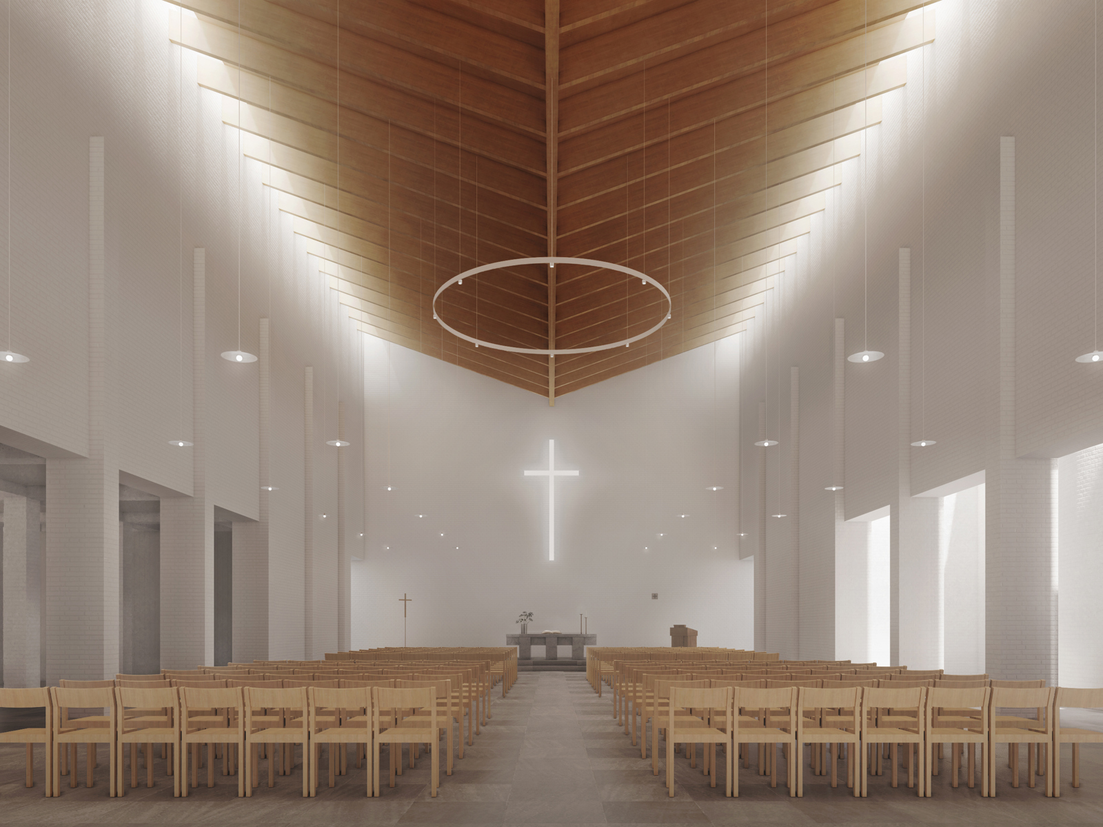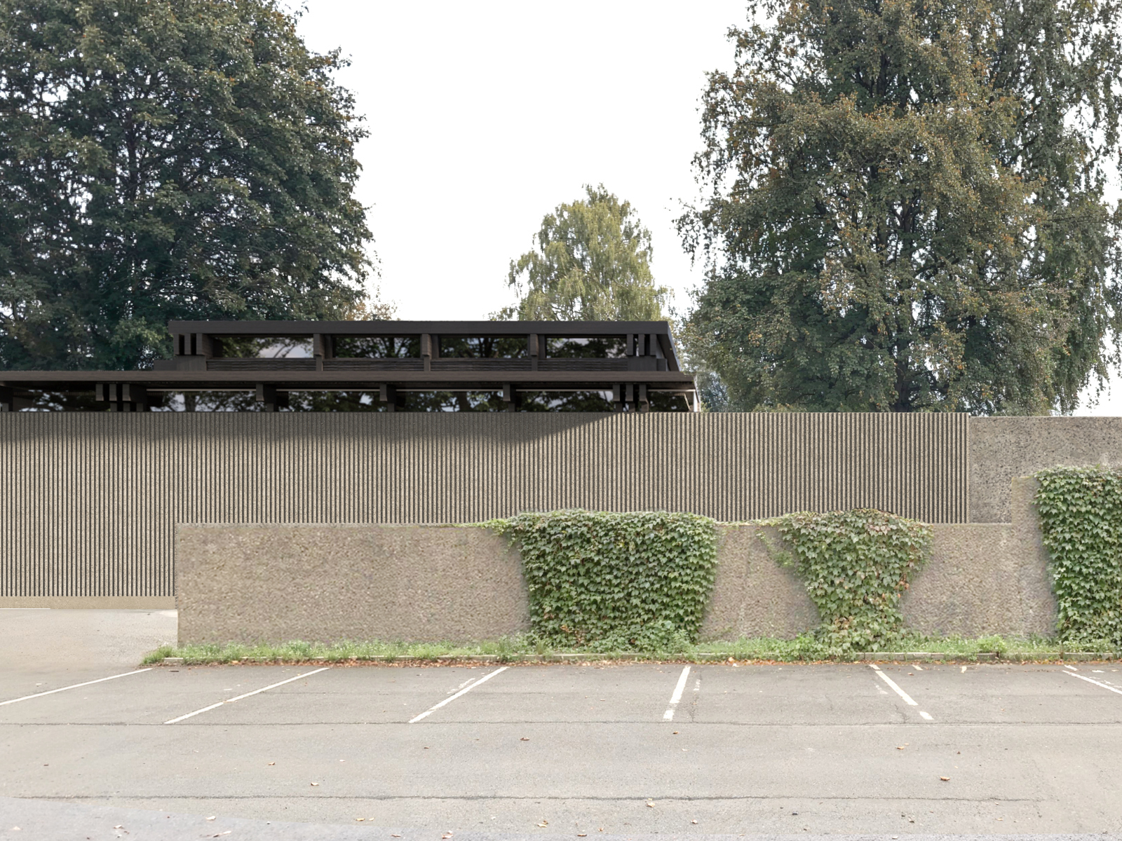 Vinnerforslaget i konkurransen om utvidelse av Haslum krematorium i Bærum, også her tegnet av Erik Langdalen, i samarbeid med Asplan Viak.
