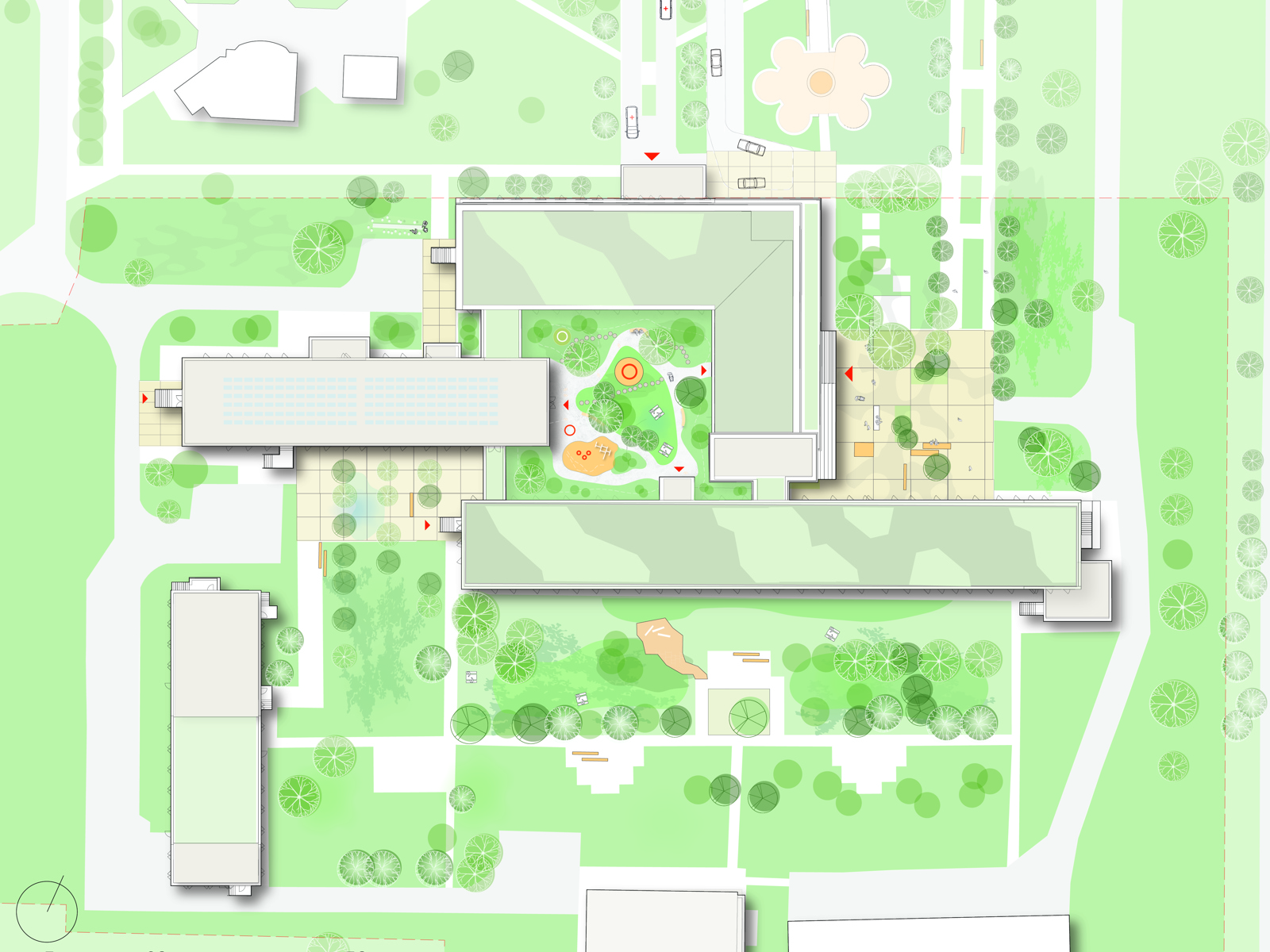 Det finnes også spor av moderne nordisk sykehusarkitektur i prosjektet. I flere år har man i Norge og Norden tenkt sykehus med horisontalt program – altså at én avdeling strekker seg over én etasje og at man ikke trenger trapper eller heis for å forflytte seg i en avdeling.