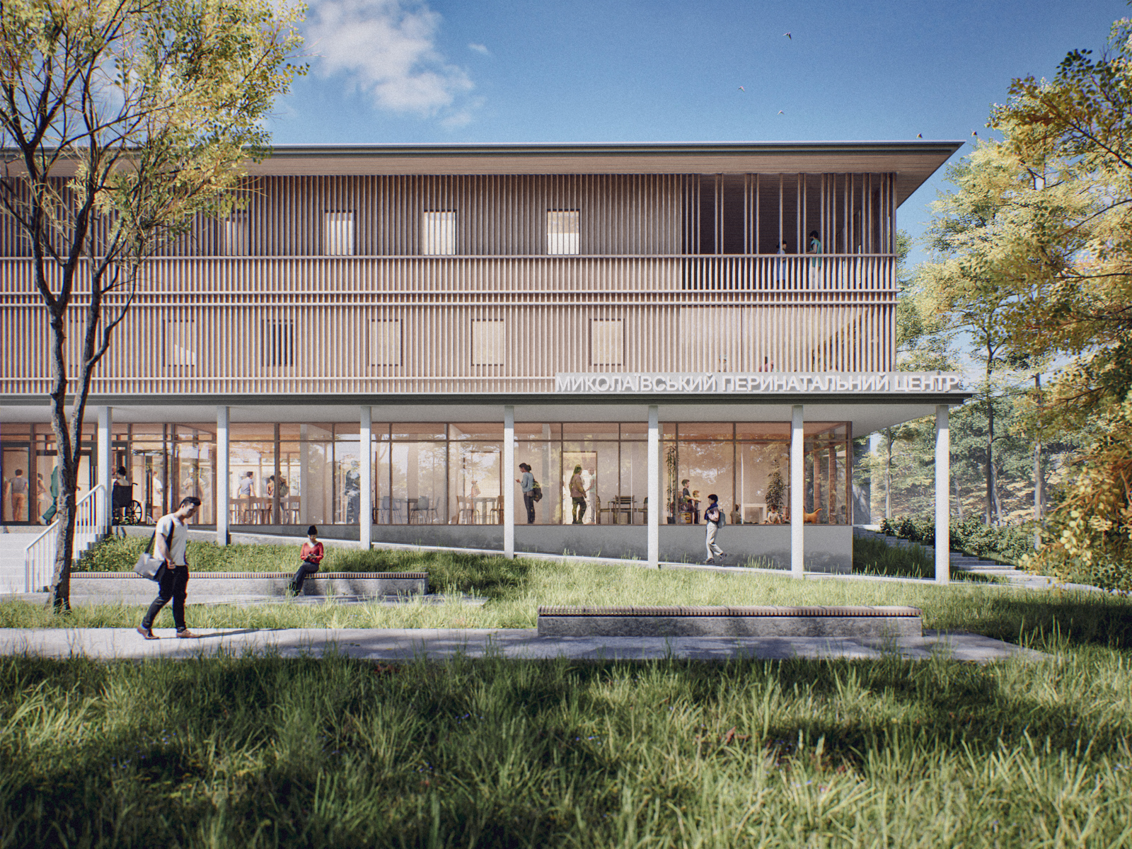 Nye Mykolajiv sykehus slik Arkitekter uten grenser har tegnet sitt vinnerforslag. Prosjektet er her tegnet med trefasade, men må mest sannsynligvis endres på grunn av ukrainske byggeforskrifter som ikke tillater tre i fasade på sykehus.