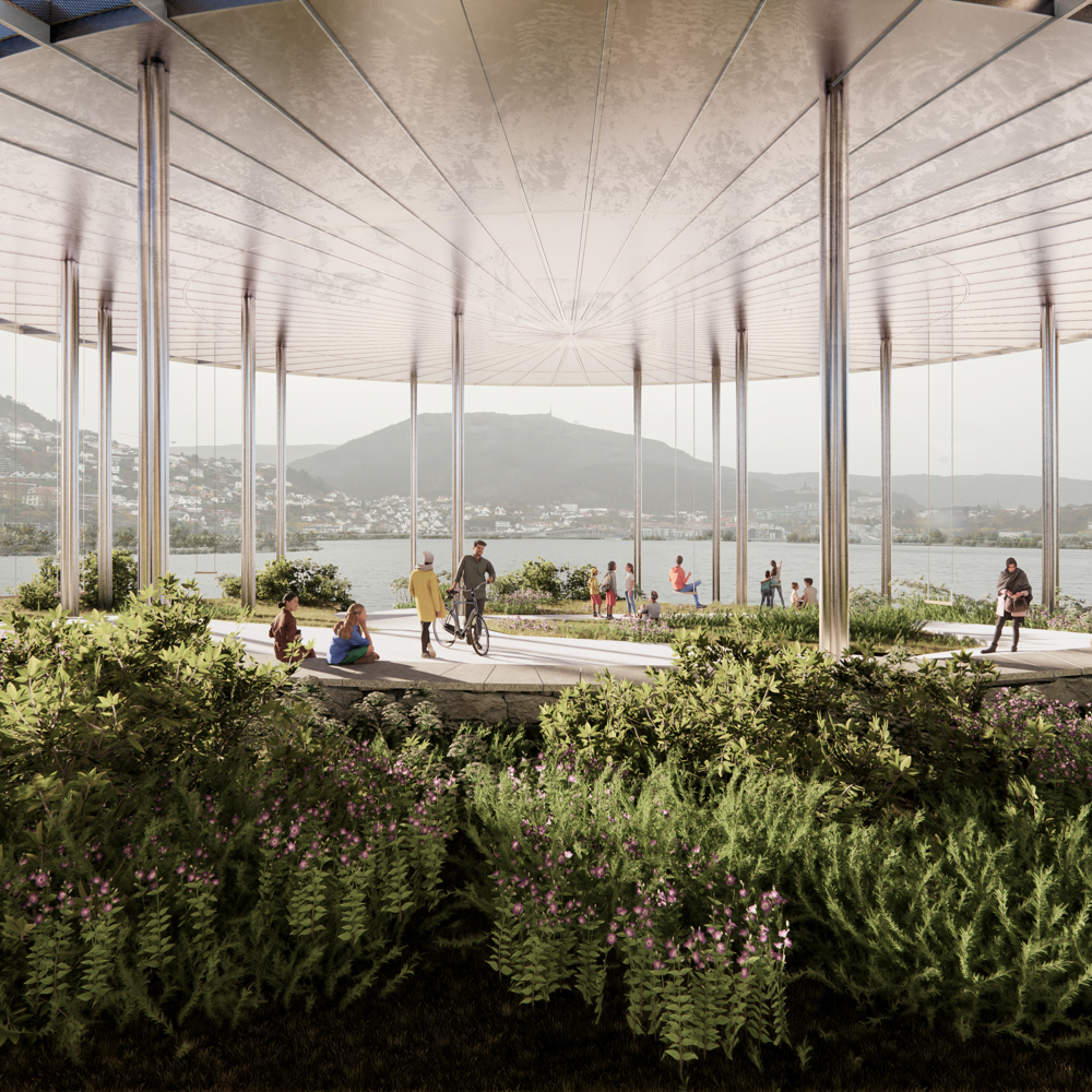 Møteplass og ly for bergensere under ny base for ambulansehelikopter i Bergen. Forslaget «Helios», fra 3RW og Sanden Hodnekvam står igjen som konkurransevinner etter klagerunde.