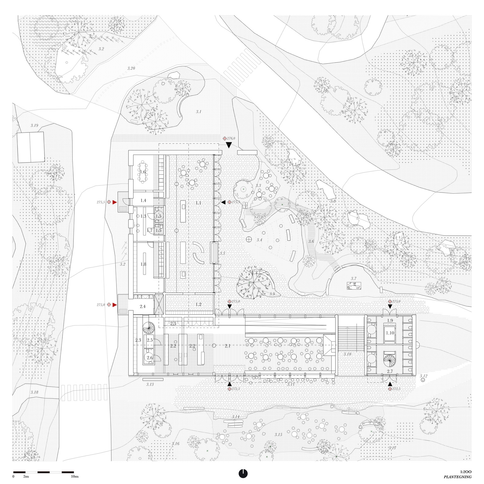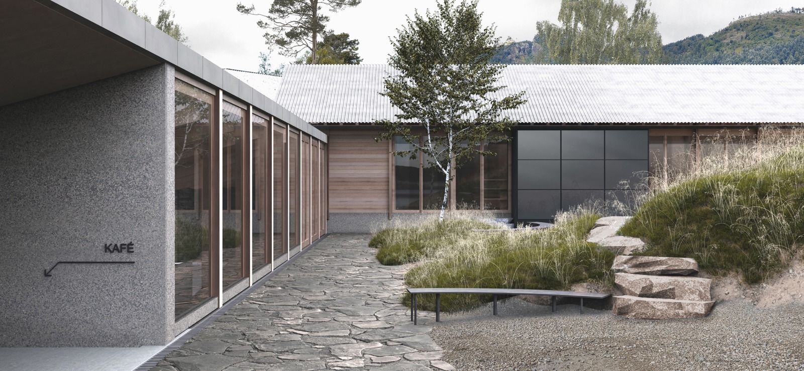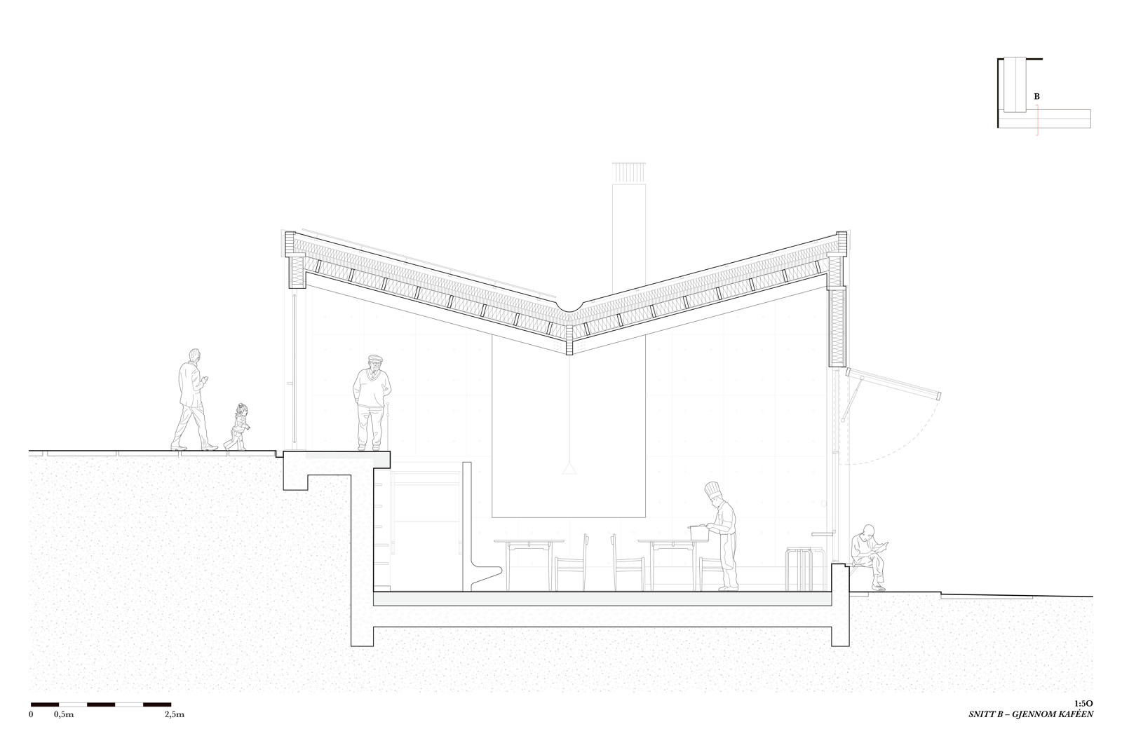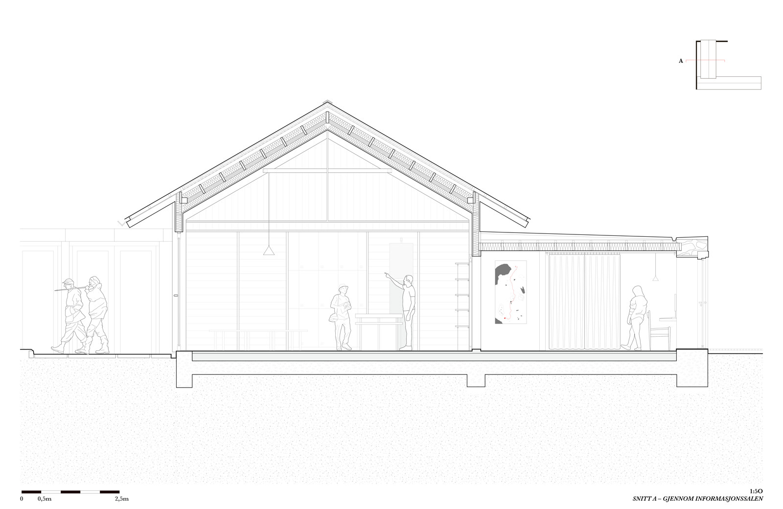 Det inverterte taket kom som følge av et ønske om å legge prosjektet lavt i det eksisterende terrenget. Den eksisterende høydeforskjellen blir tatt opp i de to volumene. Siden kafédelen ligger mot sør var det viktig at det inverterte taket lar solen komme inn på plassen og blikket gå over ut mot Revsvatnet. Det var også et ønske om at de to hovedrommene skulle ha ulike kvaliteter og karakter.