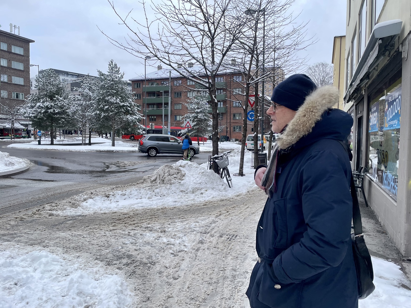 Vi har sittet inne på bakeriet og drukket kaffe, men nå må vi ut i gata. Lillebye peker og forklarer hvorfor Carl Berners plass er som den er.