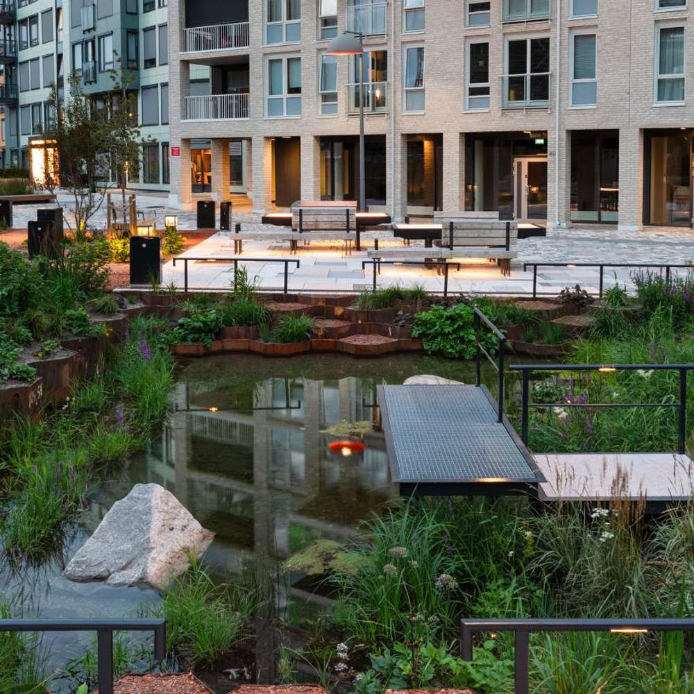 Vollebekk torg er valgt som referanseprosjekt for sirkulær landskapsarkitektur. I torgets grønne akse ligger en dam som samler overvann fra området og skaper en liten biotop på stedet.