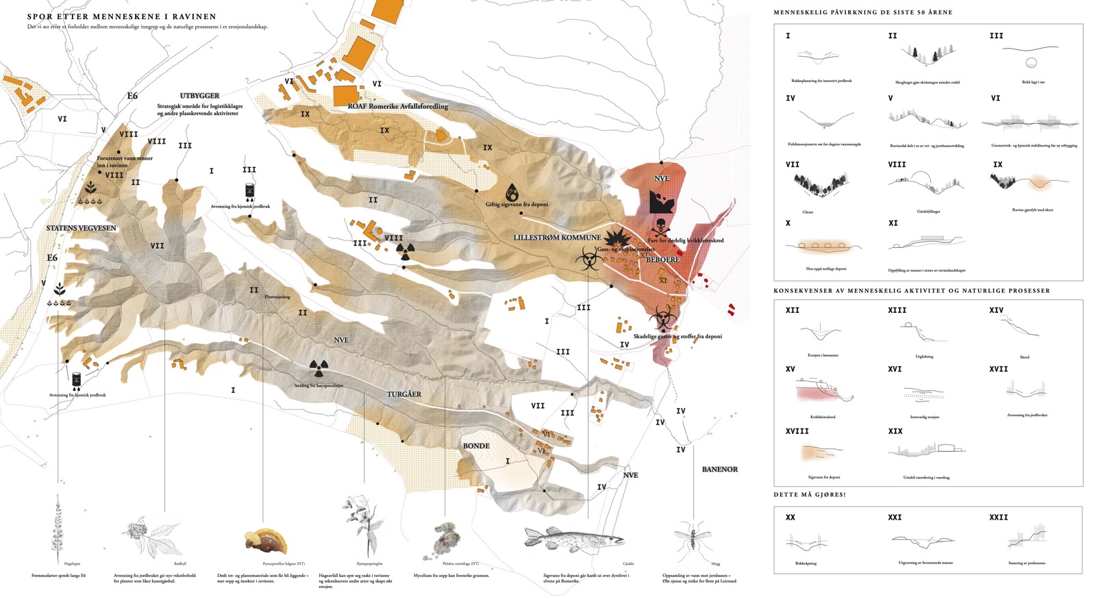 To hendelser de siste årene har gjort at Aure fikk øynene opp for ravinelandskapet hun har vokst opp i. I 2016 ble det avdekket at det seg miljøgifter opp fra et gammelt avfallsdeponi inn i boliger i Brånåsdalen. Den forurensede grunnen ga helseplager og ustabile grunnforhold. I 2020 gikk det et kvikkleireskred i Gjerdrum som krevde elleve menneskeliv. Begge de to sakene henger sammen med en type landskapsform som er i ferd med å forsvinne.