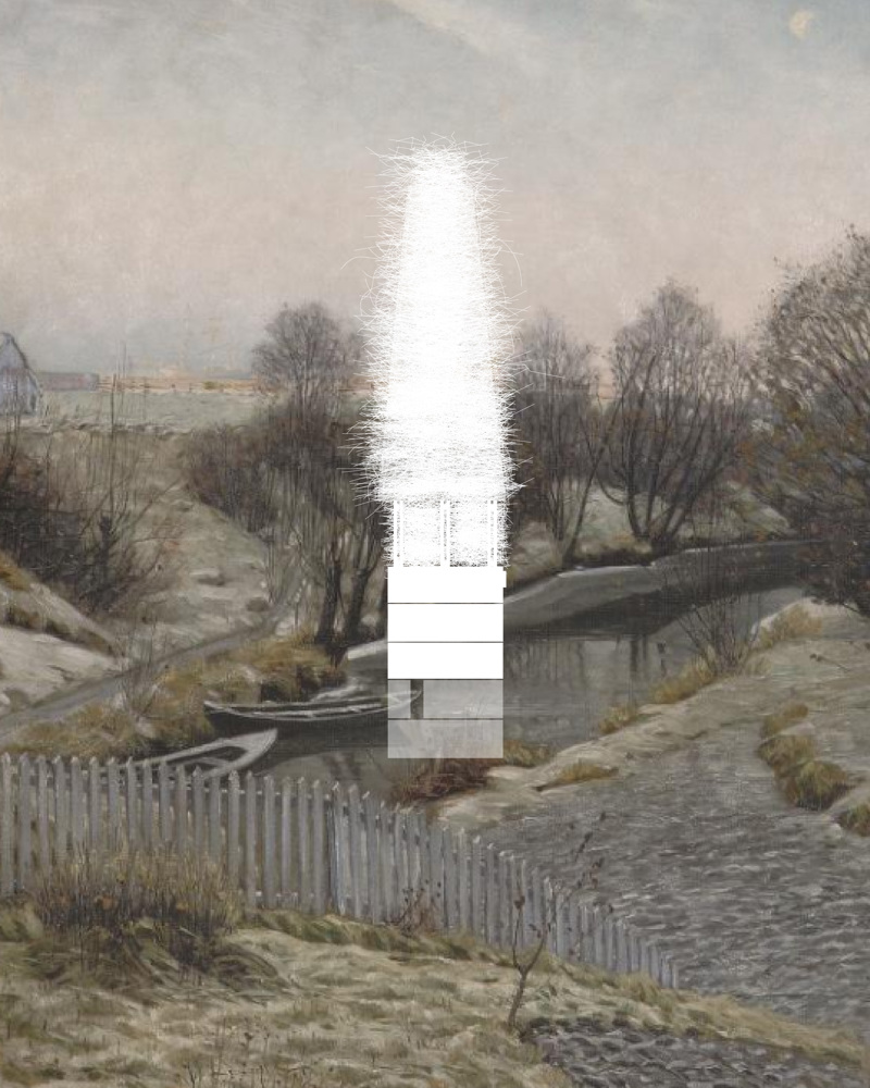 Fasade 1:100, oljemaleri av Alnaelvas nedre løp av Thorold Holmboe. Den høye folitypologien plasseres der elva er på sitt tynneste men fortsatt har behov for oppdemning og/eller rensing.