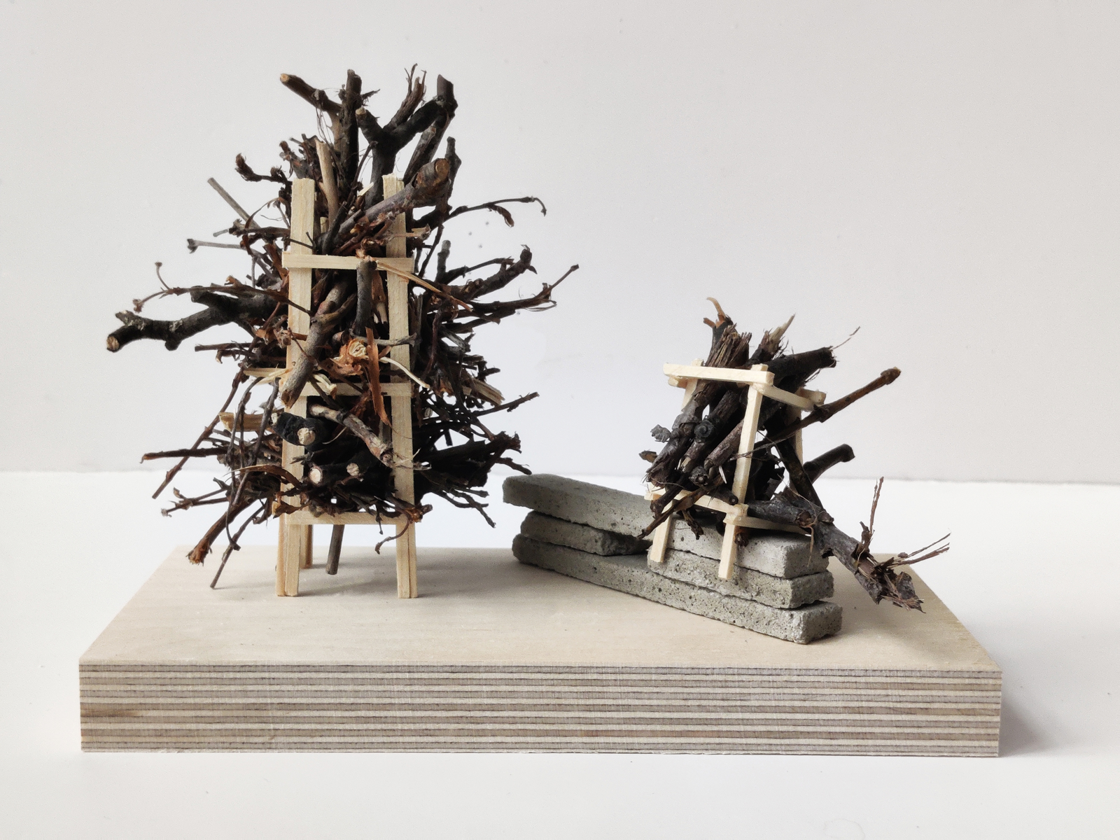 Arkitektur for humler: skissemodeller av foli, med kvist som materiale.
