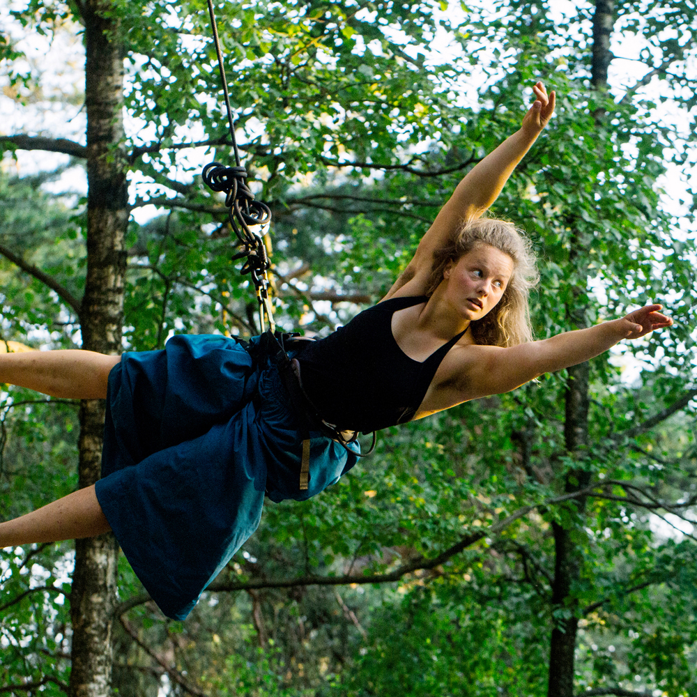 Nysirkusartisten Emma Langmoen redder naturen med kunstaktivisme. Sist hun aksjonerte tok hun med termos og matpakke, og bandt seg fast i toppen av et tre.