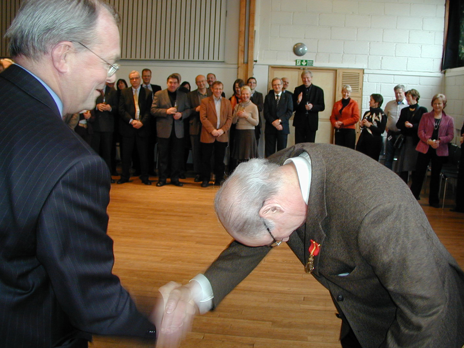 Kongens utsendte Hans J. Røsjorde (til venstre) tildeler Halvorsen Kongens fortjenestemedalje i gull.