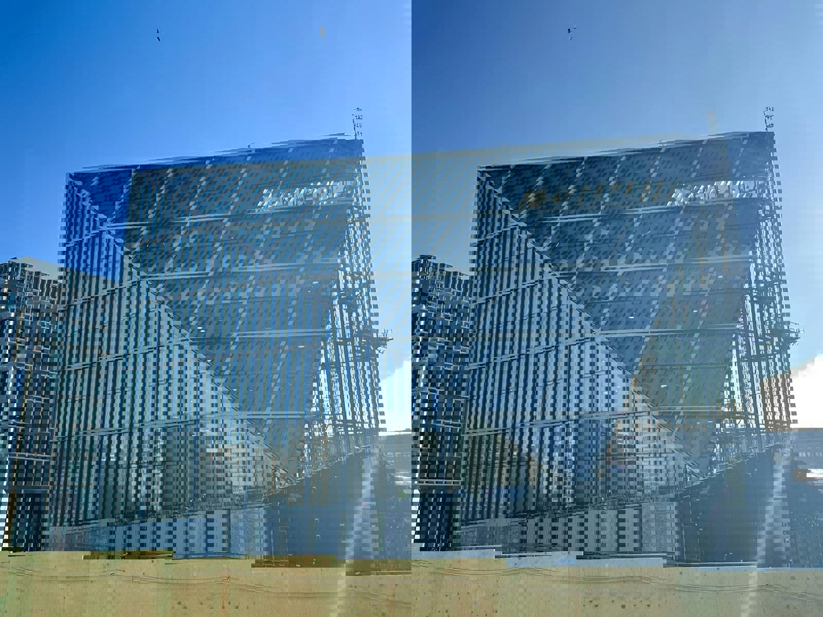 Foto: Torgeir Haugaard/ForsvaretUtenfor vinduene til kommunal- og distriktsminister Kjersti Stenseng er milliardprosjektet Regjeringskvartalet i ferd med å reise seg. Der den Erling Viksjø-tegnede Y-blokka en gang sto, blir trekantvinduer heist på plass i A-blokka, som er innflyttingsklar våren 2026.