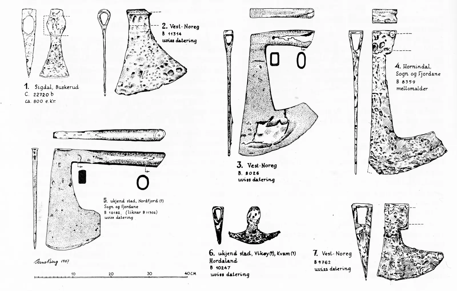 Arkitekt og bygningshistoriker Arne Bergs illustrasjoner av historiske økser fra Vestlandet.