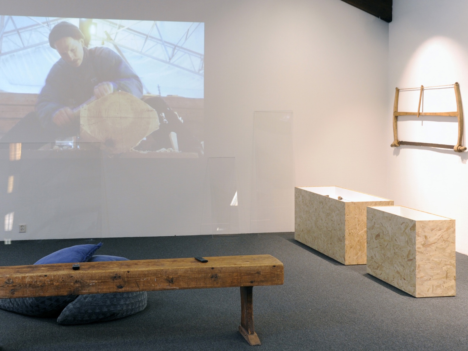 På veggen vises film om restaurering av Dagsgardloftet frå 1256 (utlånt av Maihaugen) med håndverkerne Henning Svensrud, Martin Bjønness Ribu og Anders Hagen. Til høyre henger grindsager fra museets samling.