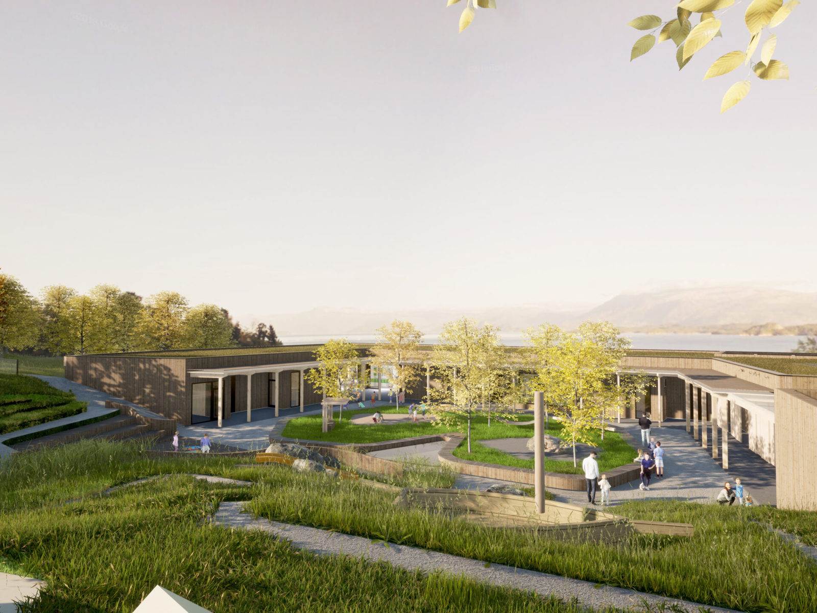 Onarheim barnehage i Bergen har en grønn oase i midten av atriet med frodig vegetasjon og lekeapparater med naturlig preg.