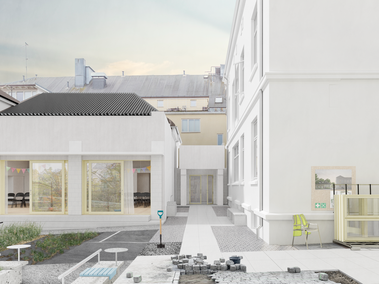 Illustrasjon fra konkurransen om Arkitektenes hus. Hovedinngangen til salen legges om, slik at alle besøkende ankommer samme vei. Tilbygget av Telje-Torp-Aasen utvides med en ny fasade som åpnes opp mot bakgården, som transformeres fra parkeringsplass til et grønt og allsidig uterom.