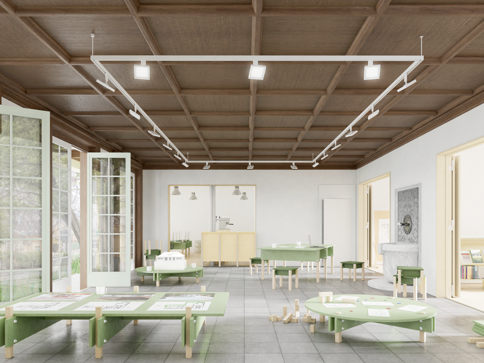 Illustrasjon fra konkurransen om Arkitektenes hus. Første etasje i paviljongbygget åpnes opp og blir fylt med café, bokhandel, utstillinger, leserom m.m. Aktivitetene flyter over i hverandre i Hagestua i midten.