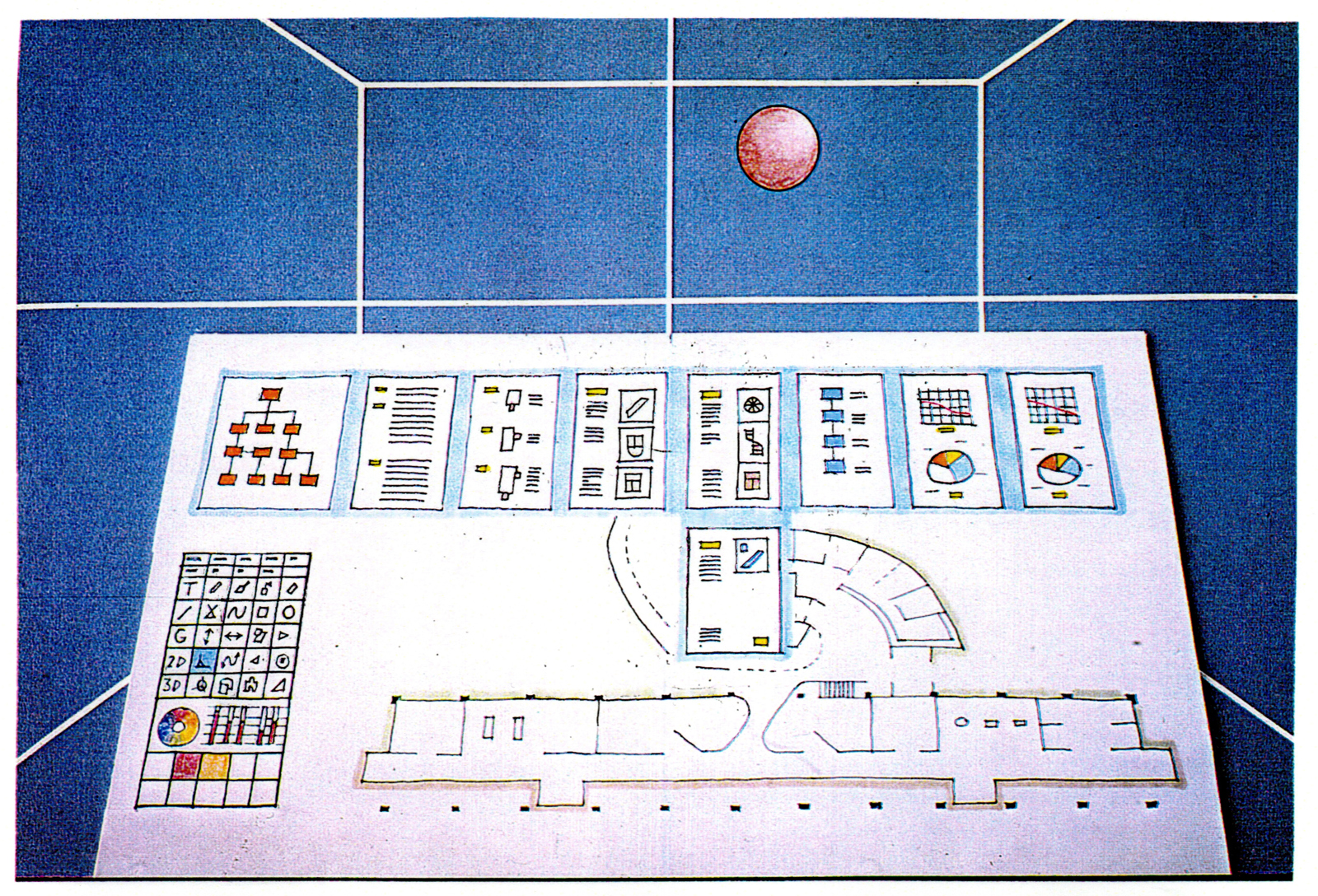 Hovedkomponentene i systemet. Bakerst: Et digitalt tegnebord med oppløsning som en fotosetter og ubegrensede fargemuligheter. Midt høyre: Datamaskin med tilstrekkelig ytelse og eksterne lagringsmedier. Midt venstre: kombinert plotter og skanner med samme oppløsning og fargekvalitet som tegnebordet. Foran venstre: industrirobot for modellbygging. Foran høyre: holografisk prosjektør for tredimensjonale modellstudier.